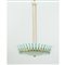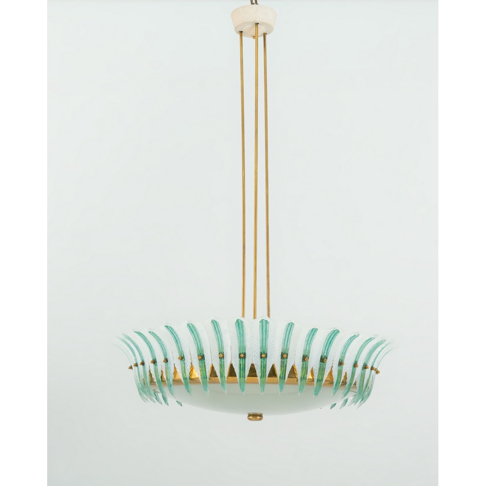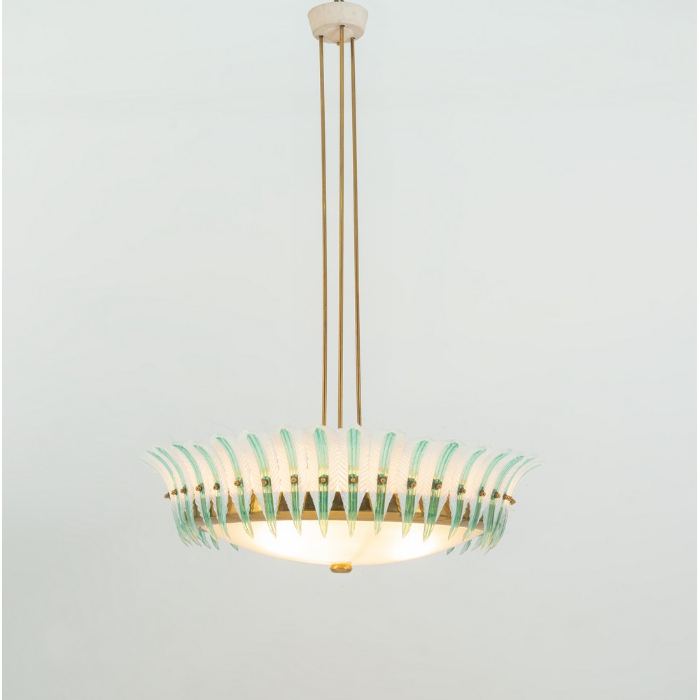 Rara lampada a sospensione a tre luci, struttura in ottone, diffusore circolare in ottone lucido, foglie a palmetta in vetro lattimo con costola verde e oro (una foglia incollata).