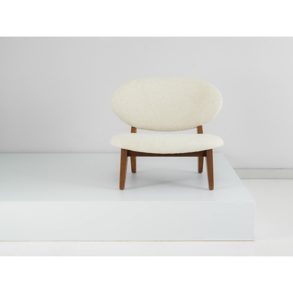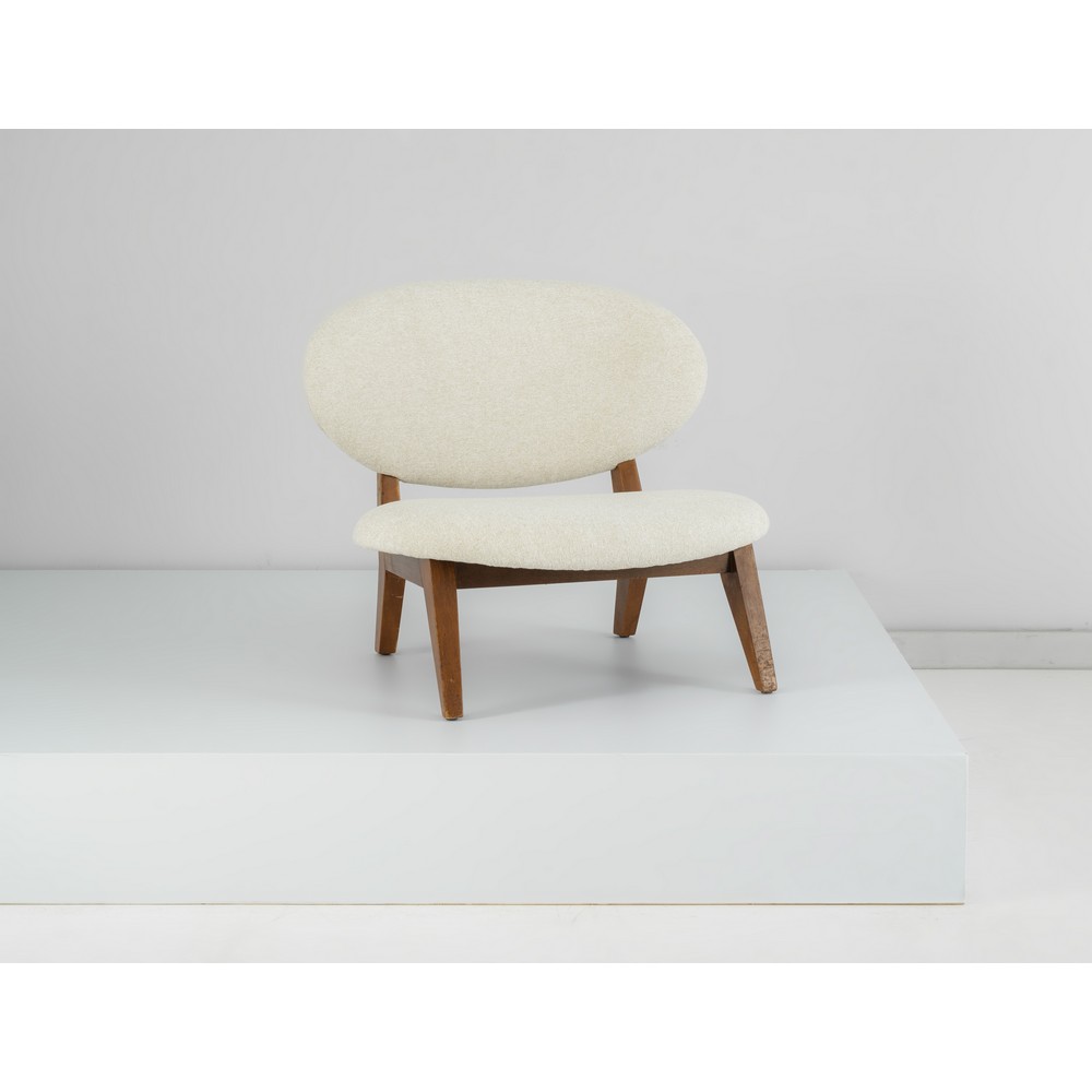 Poltrona bassa con struttura in legno ebanizzato, ampia seduta e spalliera imbottite e rivestite con tessuto chiaro. Restaurata.