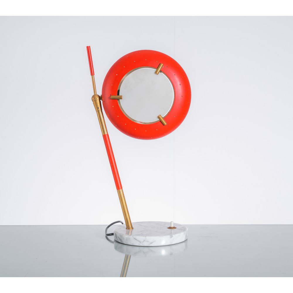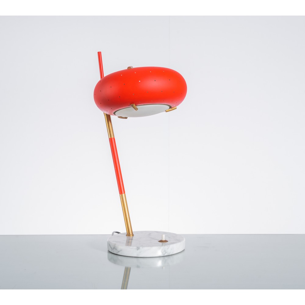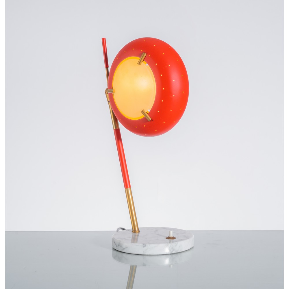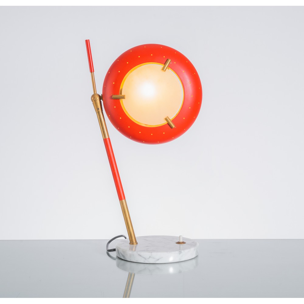 Lampada da tavolo ad una luce, struttura in ottone e metallo verniciato rosso, diffusore sferico schiacciato orientabile in metallo verniciato rosso con forature, doppia lente in vetro opale, base in marmo di Carrara.