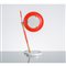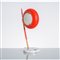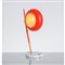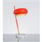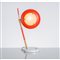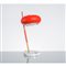 Lampada da tavolo ad una luce, struttura in ottone e metallo verniciato rosso, diffusore sferico schiacciato orientabile in metallo verniciato rosso con forature, doppia lente in vetro opale, base in marmo di Carrara.