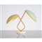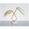 Lampada da tavolo a due luci, struttura in tondino di ottone, diffusori in metallo verniciato uno nei toni del verde e uno giallo, base circolare in marmo bianco di Carrara. Etichetta di produzione.