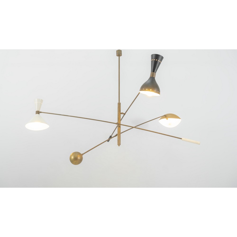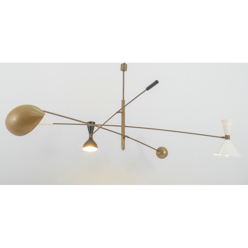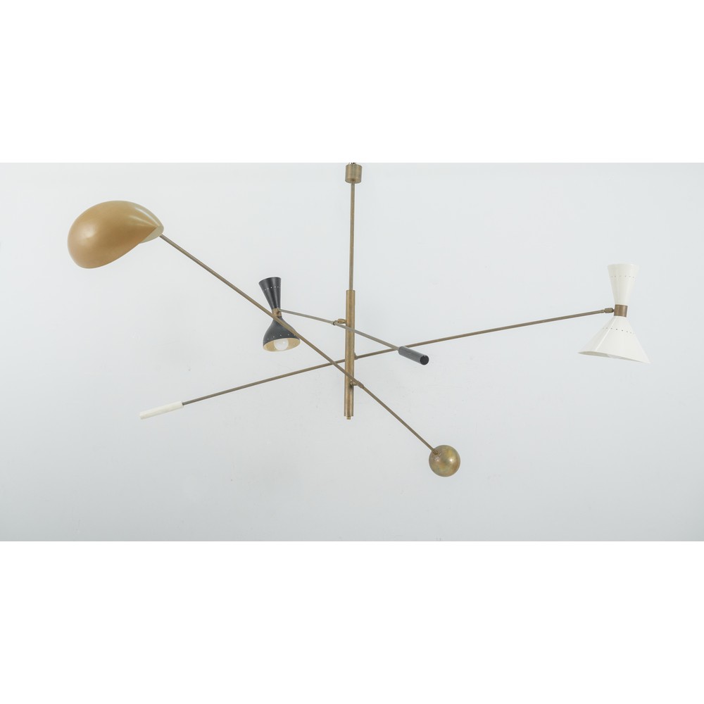 Lampada a sospensione a tre luci, struttura in ottone con bracci orientabili a bilanciere, diffusori di forma differente in metallo laccato bianco, nero e avorio.