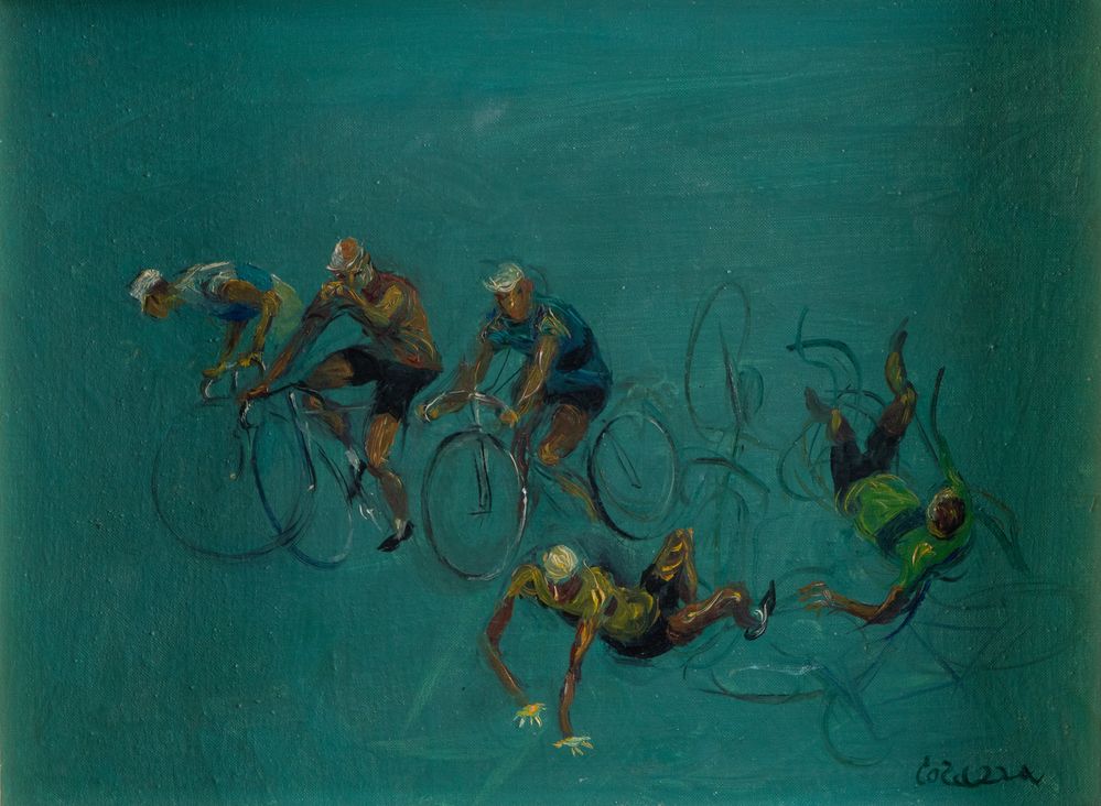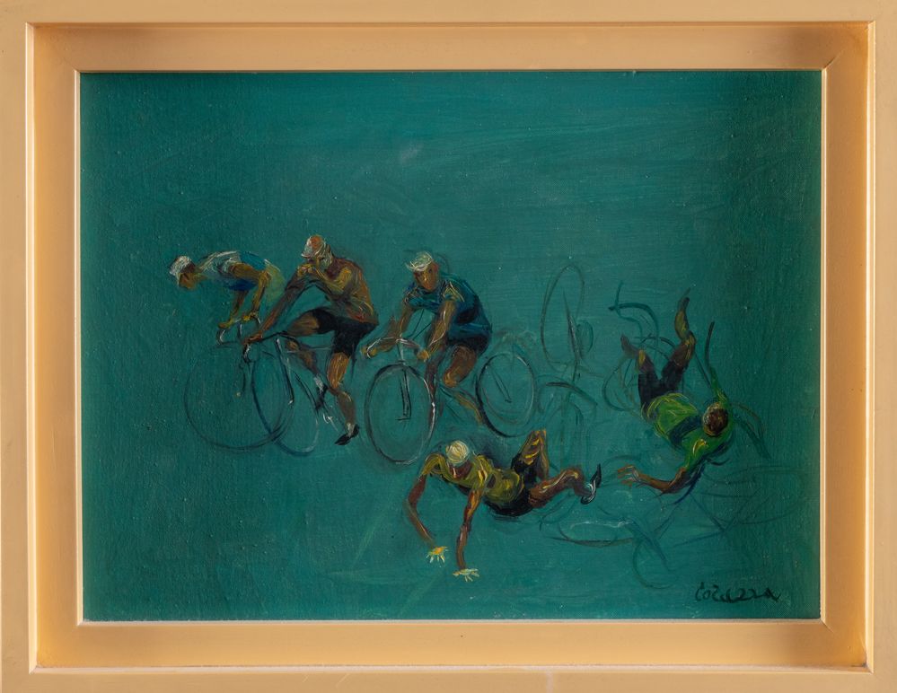 NINO CORRADO CORAZZA (Bologna 1897 - 1975) "Ciclisti". Olio su tela. Cm 30x40. Opera fimata in basso a destra Corazza.