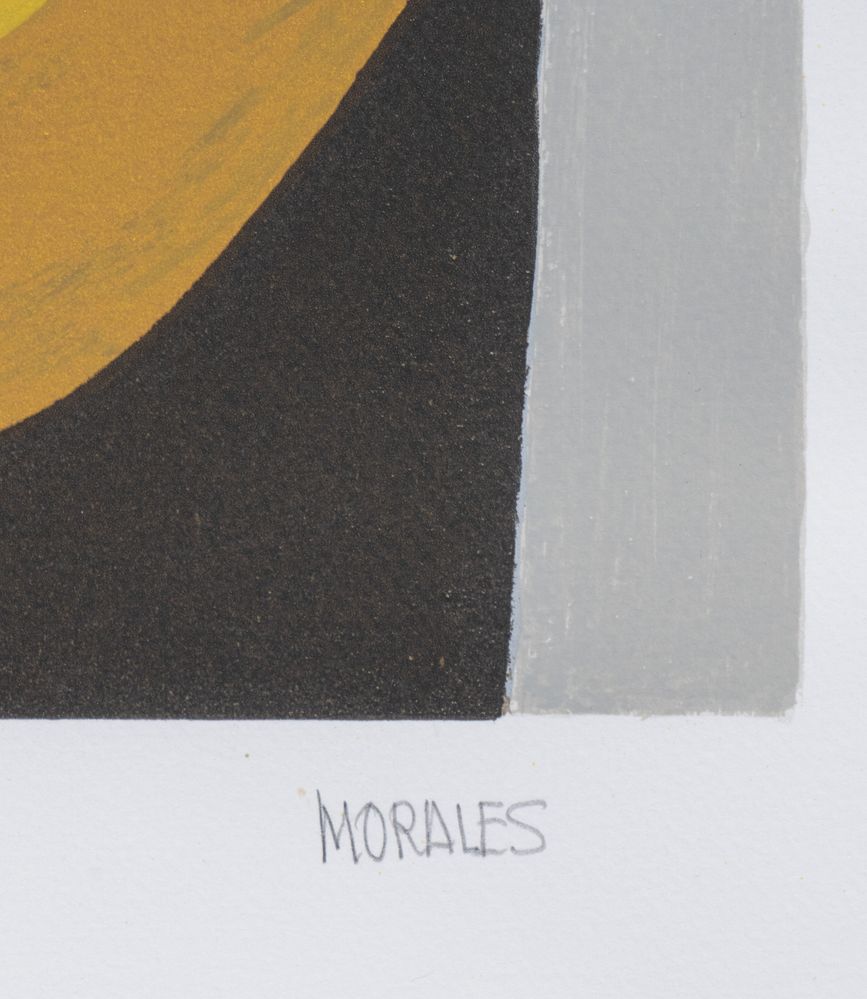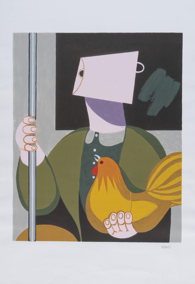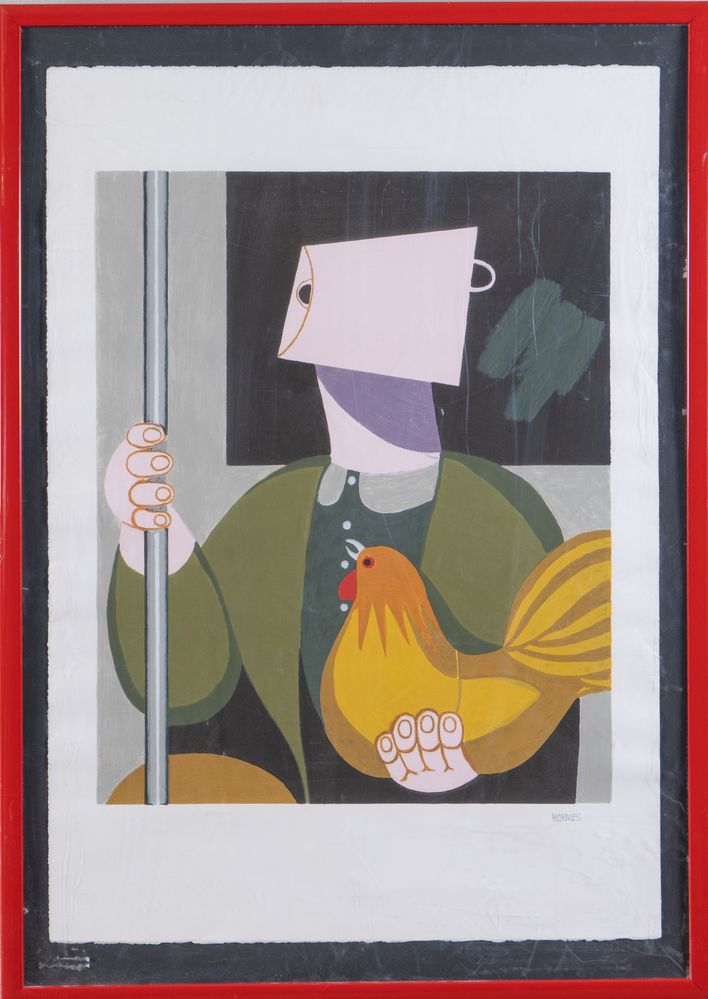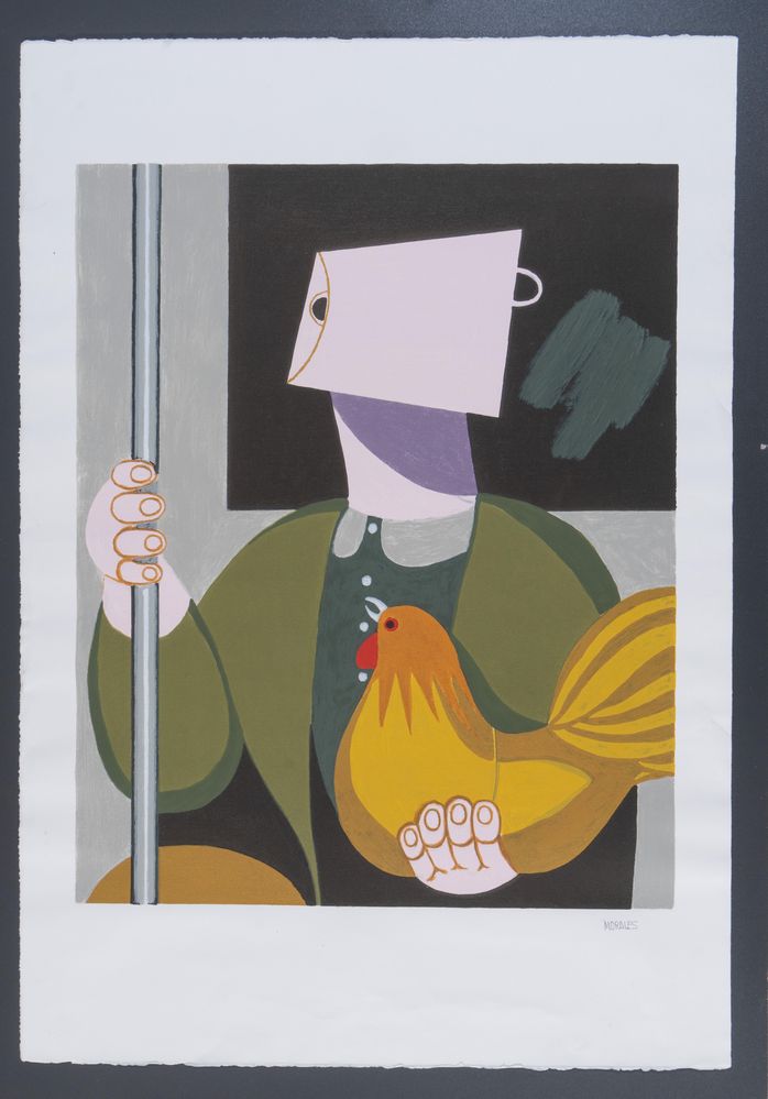 PEPE MORALES (Spagna 1933) "Campesino en el metro". Litografia a colori su carta. Cm 90,5x63,5. Opera firmata in basso a destra Morales.