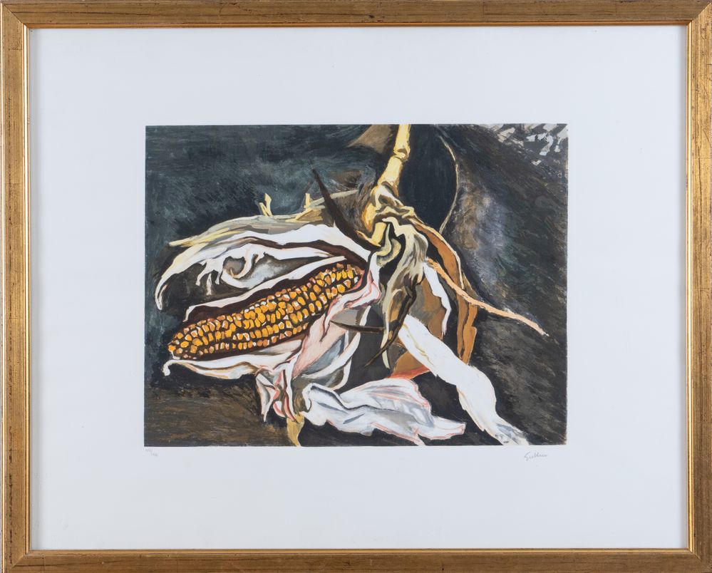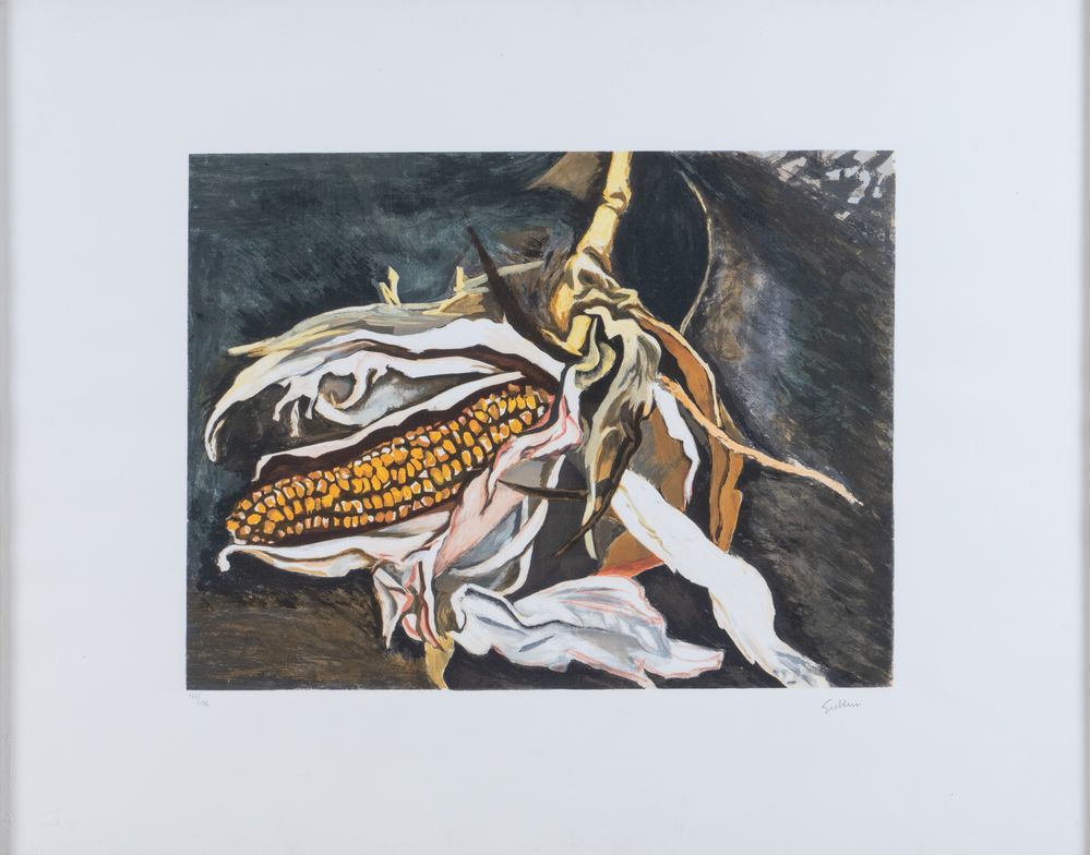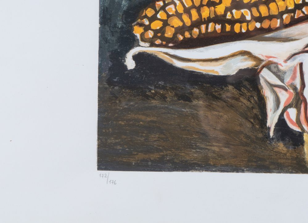 RENATO GUTTUSO (Bagheria 1911 - Roma 1987) "Pannocchia". Litografia a colori su carta. Lastra: cm 37,5x50; foglio: cm 63x80. Opera firmata in basso a destra Guttuso. Reca numeri di tiratura in basso a sinistra 172/176. Reca in basso a sinistra quattro timbri a secco. Opera corredata da certificato di autenticità di Fade Arte, Bologna in data 4 Dicembre 1987.