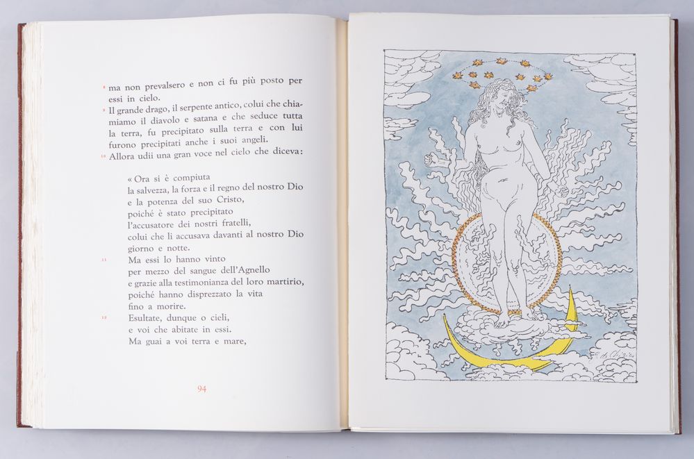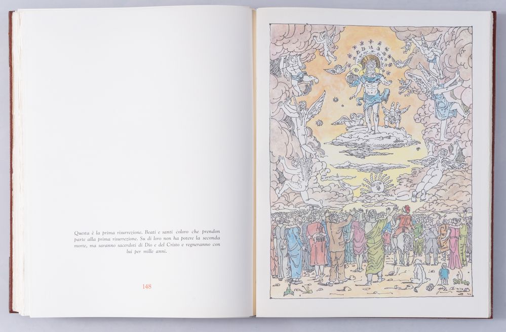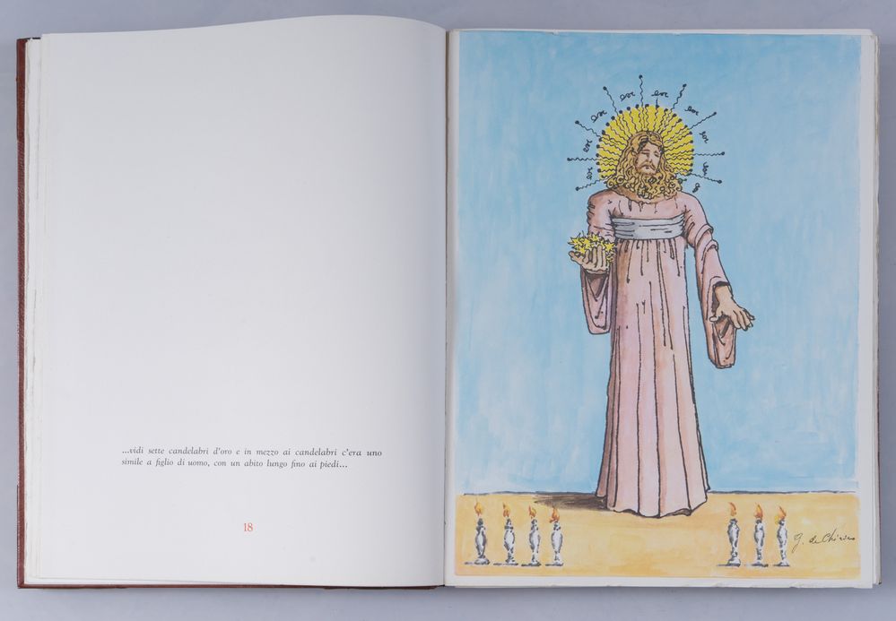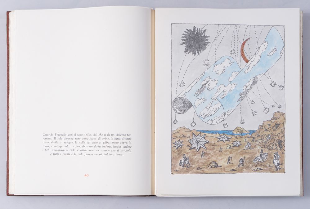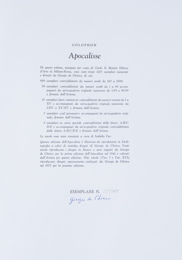 Le tavole sono state stampate a cura di Isabella Far. Questa edizione dell'Apocalisse è illustrata da riproduzioni in fotolitografia a colori di ventidue disegni di Giorgio de Chirico. Venti tavole riproducono i disegni in bianco e nero eseguiti da Giorgio de Chirico per la prima edizione dell'Apocalisse nel 1941 e colorati dall'Artista per questa edizione. Due tavole (Tav. I e Tav. XVI) riproducono disegni espressamente realizzati da Giorgio de Chirico nel 1977 per la presente edizione. (difetti)