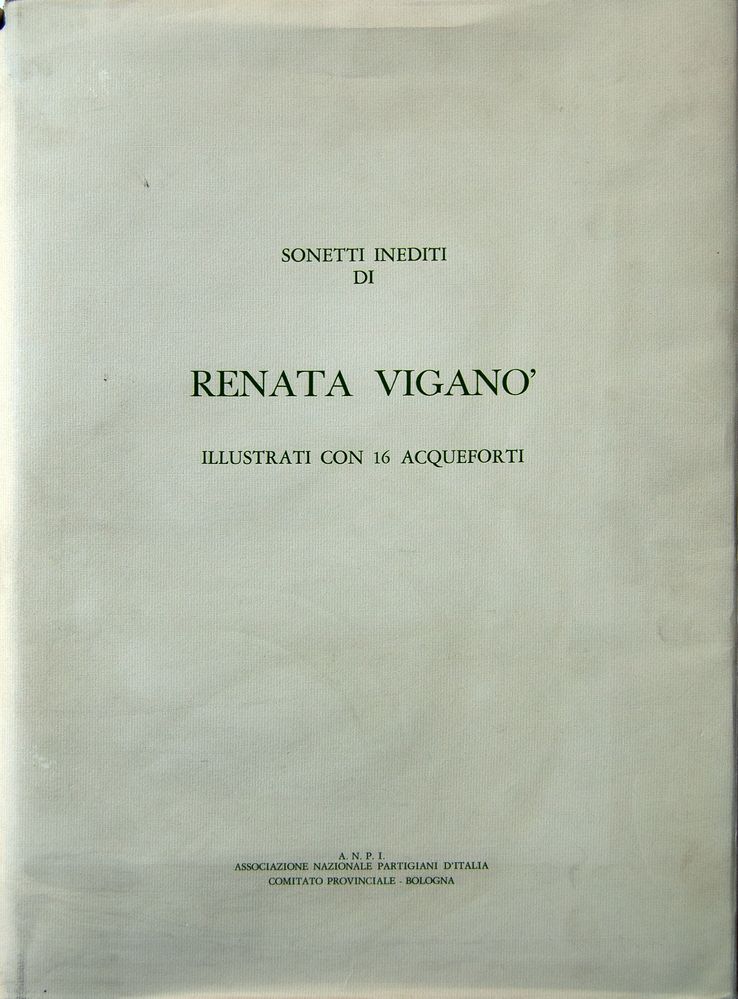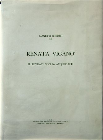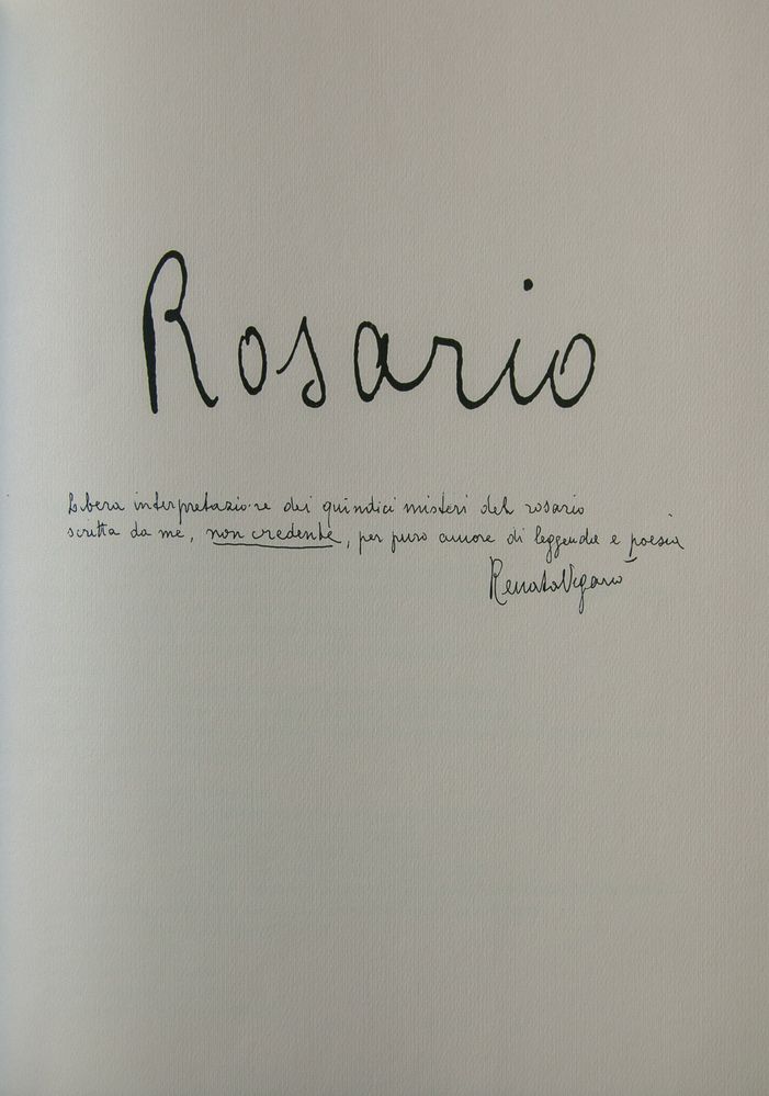 RENATA VIGANO' (Bologna 1900 - 1976) "Rosario. Libera interpretazione dei quindici misteri del rosario scritta da me, non credente, per puro amore di leggenda e poesia", 1984. Raccolta di poesie di Renata Vigano', accompagnata da sedici litografie a colori su carta di Claudio Cappelli, Valerio Cattoli, Vittorio Cavicchioni, Gino Covili, Umberto Folli, Renato Guttuso, Laura Melis, Luciano Minguzzi, Augusto Murer, Olia Reza, Ilario Rossi, Giulio Ruffini, Alberto Sughi, Ernesto Treccani, Francesco Verlicchi e Tono Zancanaro. Cm 51,7x36x3. Ciascuna reca numeri di tiratura 56/99. Bologna, A.N.P.I., 1984.