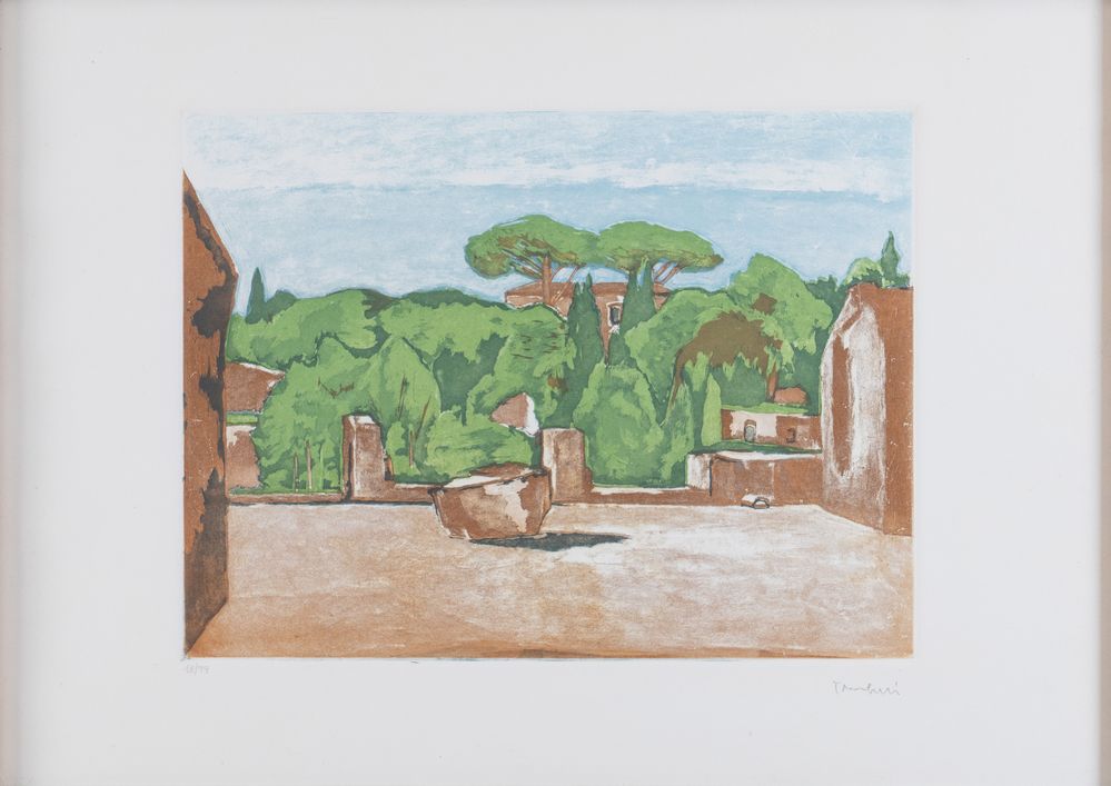 ORFEO TAMBURI (Jesi 1910 - Ermont 1994) "Paesaggio". Litografia a colori su carta. Lastra: cm 33x44,2; foglio: cm 48x67,5. Opera firmata in basso a destra Tamburi. Reca numeri di tiratura in basso a sinistra 18/99.