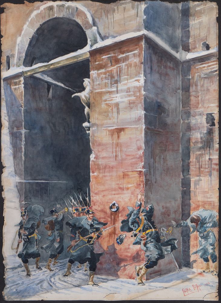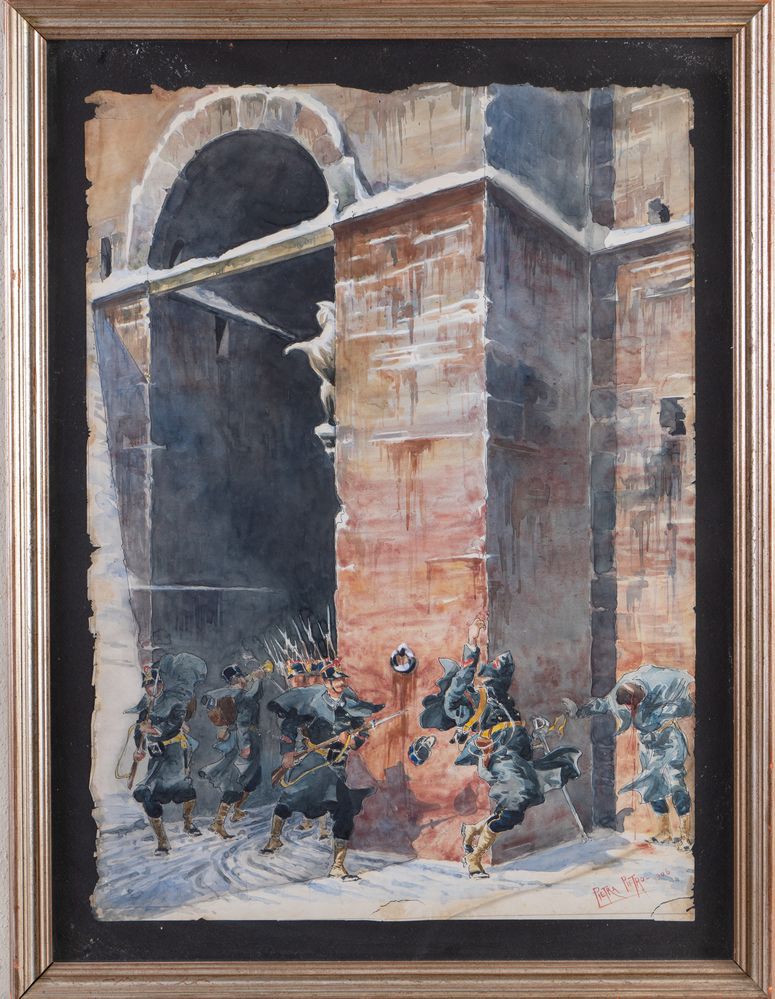 PIETRO PIETRA (Bologna 1885 - 1956) "Architettura", 1906. Acquerello su carta. Cm 62,5x45,5. Opera firmata in basso a destra Pietra Pietro 1906.