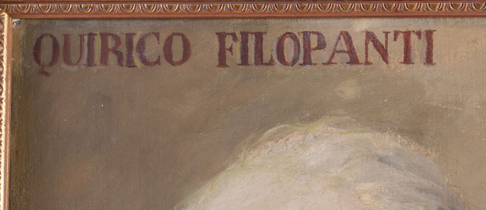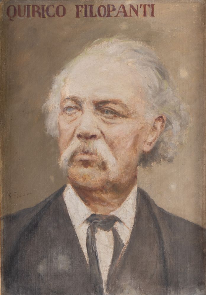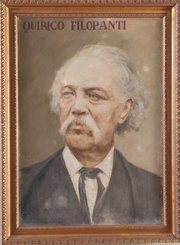 FABIO FABBI (Bologna 1861 - Casalecchio di Reno 1945) "Ritratto di Quirico Filopanti". Olio su tela. Cm 51x36. Opera firmata in basso a sinistra F. Fabbi.