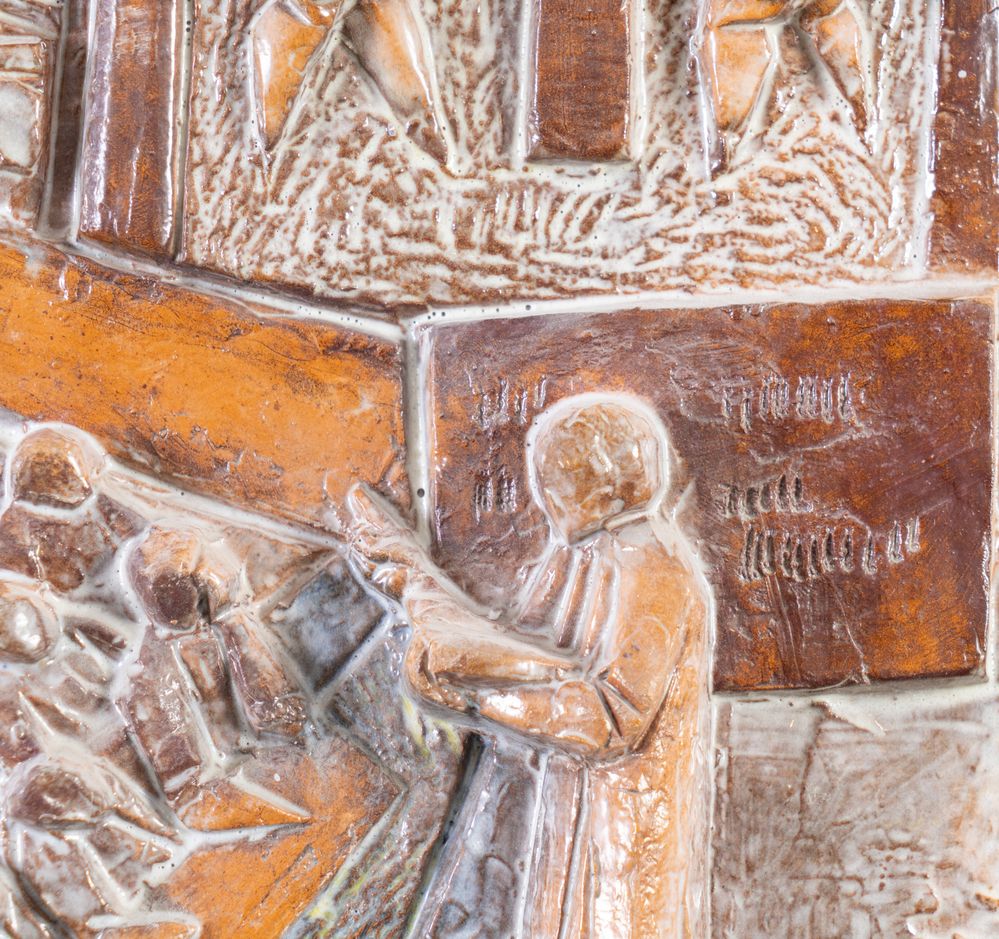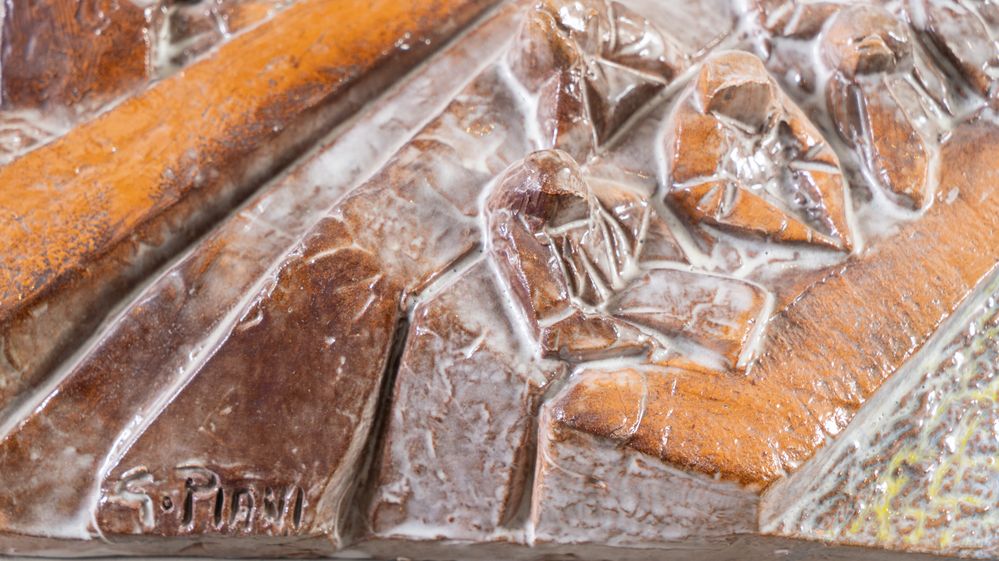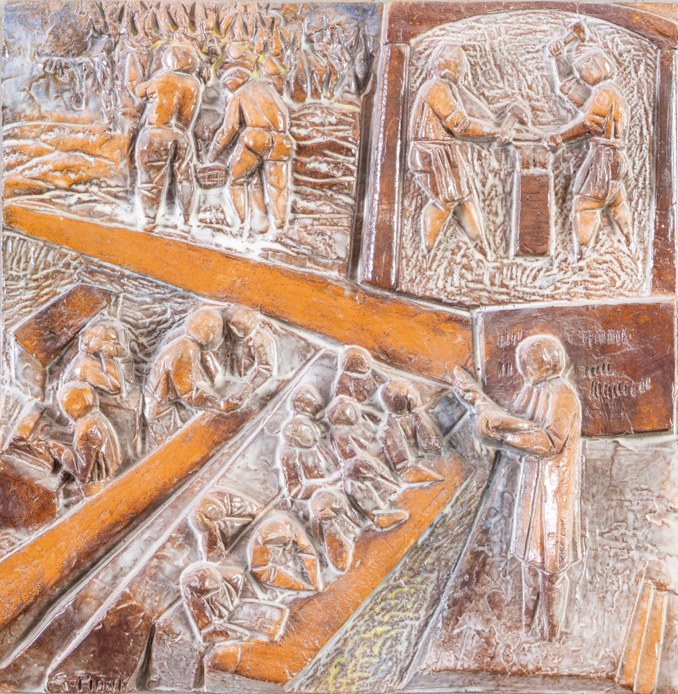 GIANCARLO PIANI (Predappio 1940 - Faenza 1999) "Mestieri". Bassorilievo in terracotta smaltata policroma. Cm 38,5x38. Opera firmata in basso a sinistra G. Piani.