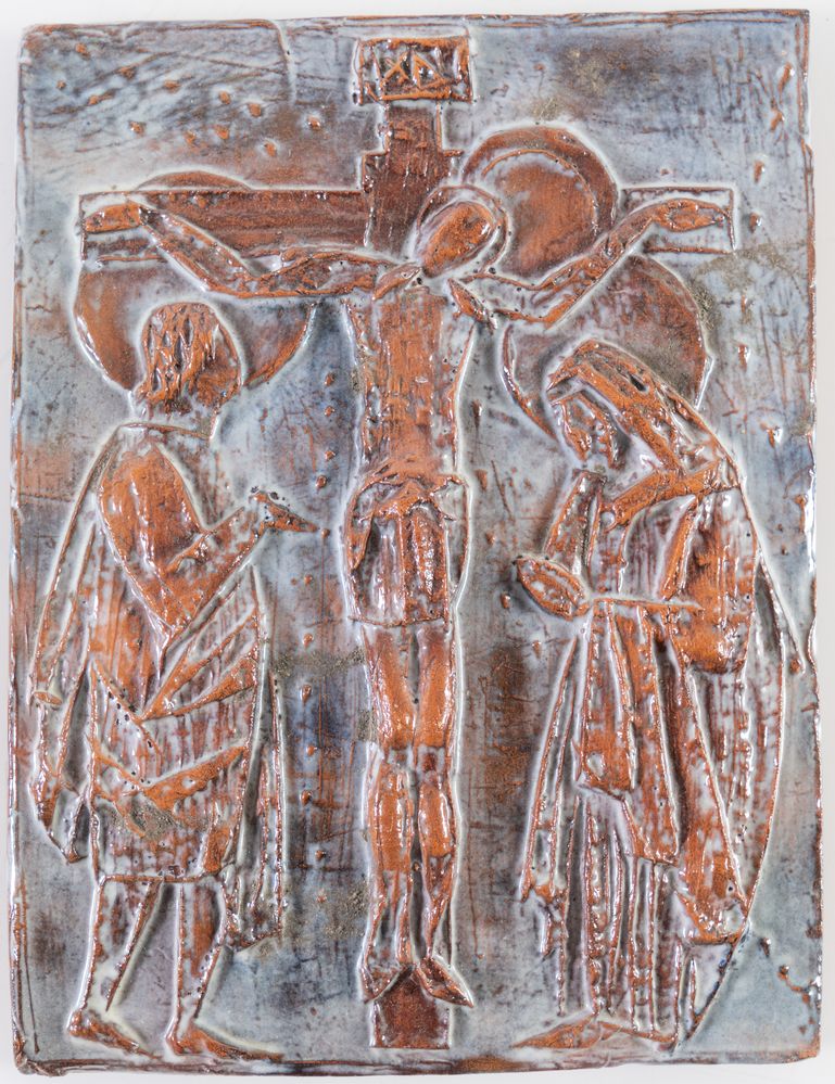 GIANCARLO PIANI (Predappio 1940 - Faenza 1999) "Via Crucis". Bassorilievo in terracotta smaltata policroma. Cm 23x17,5.