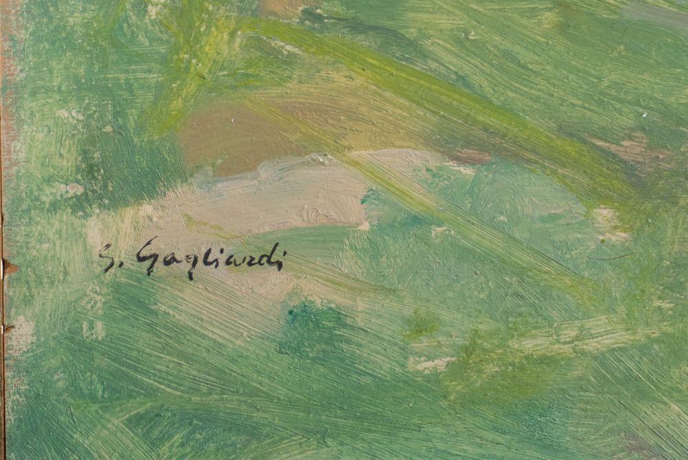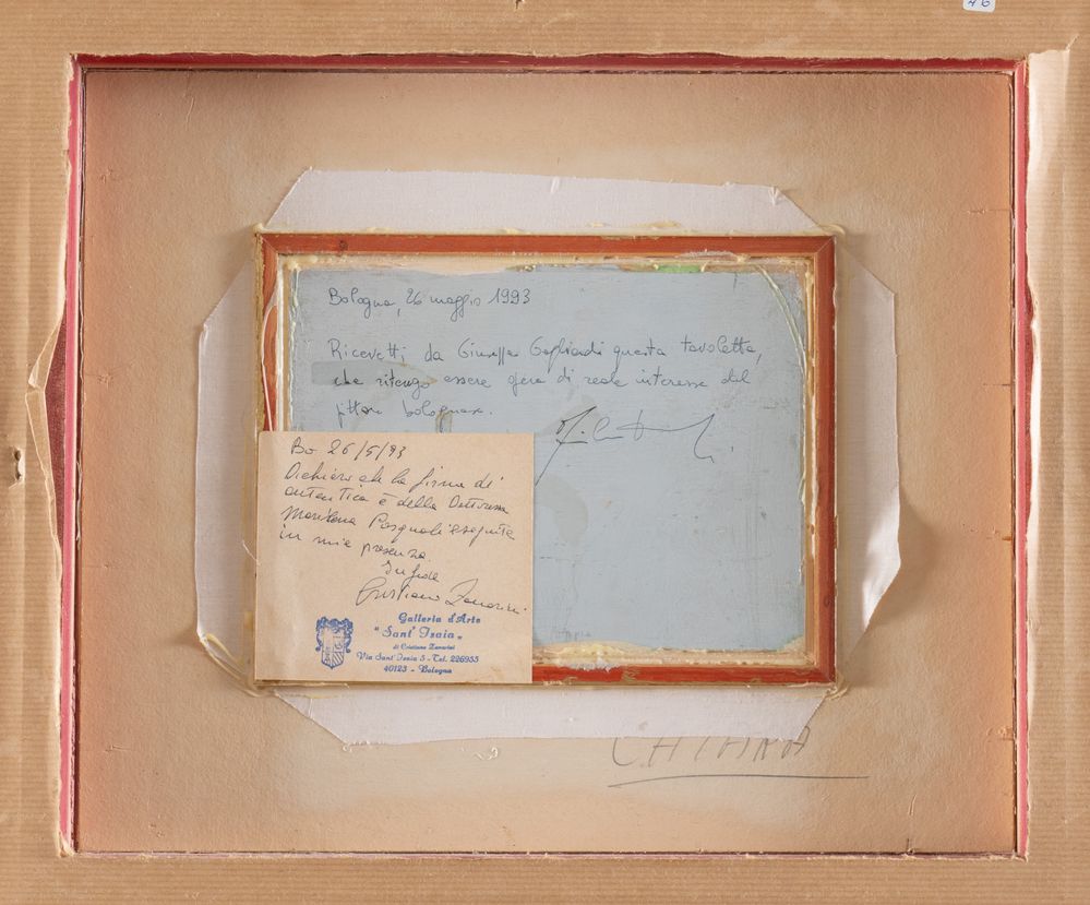 GIUSEPPE GAGLIARDI (Bologna 1902 - 2005) "San Luca". Olio su tavola. Cm 22,5x16,5. Opera firmata in basso a sinistra G. Gagliardi. Al retro reca etichetta della Galleria d'Arte Sant'Isaia.
