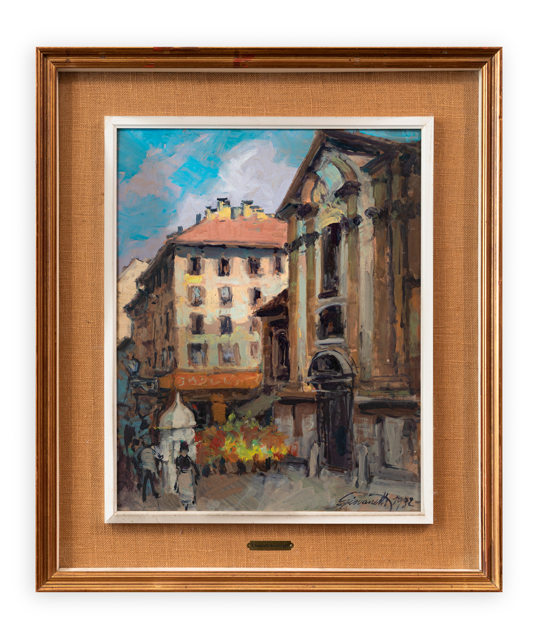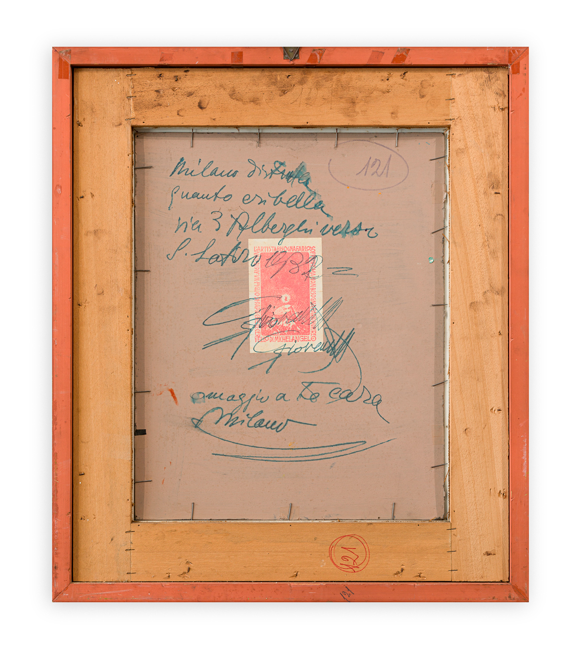 Firma, titolo e iscrizione 'Omaggio a te cara Milano' al retro