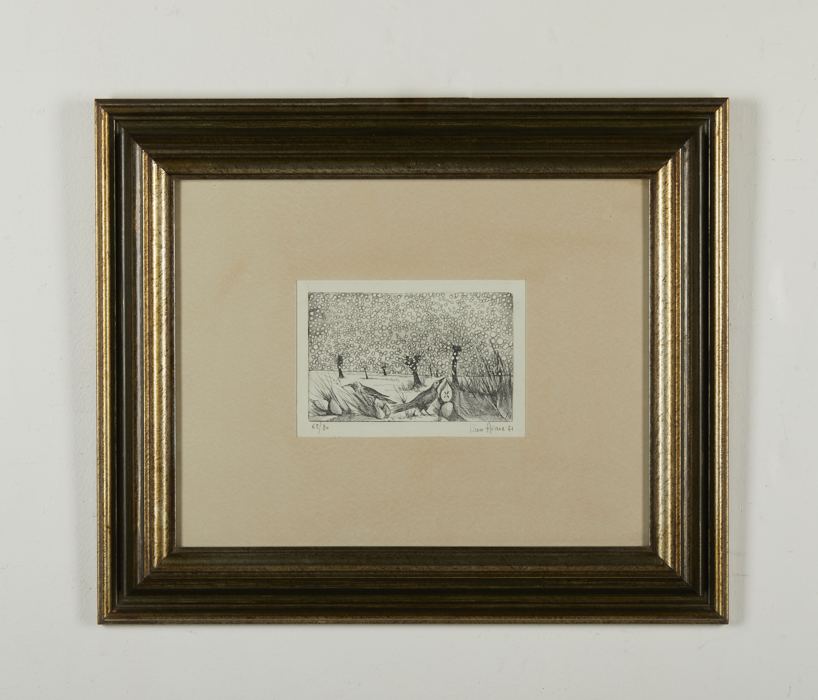 AIME TINO (1931 - 2017) Senza titolo. 1971. Acquaforte. Cm 45,00 x 35,50. 63/80. Tiratura, firma e anno in basso a matita. Dimensione lastra: 11.5x18.5 cm. Lievi difetti. Cornice presente
