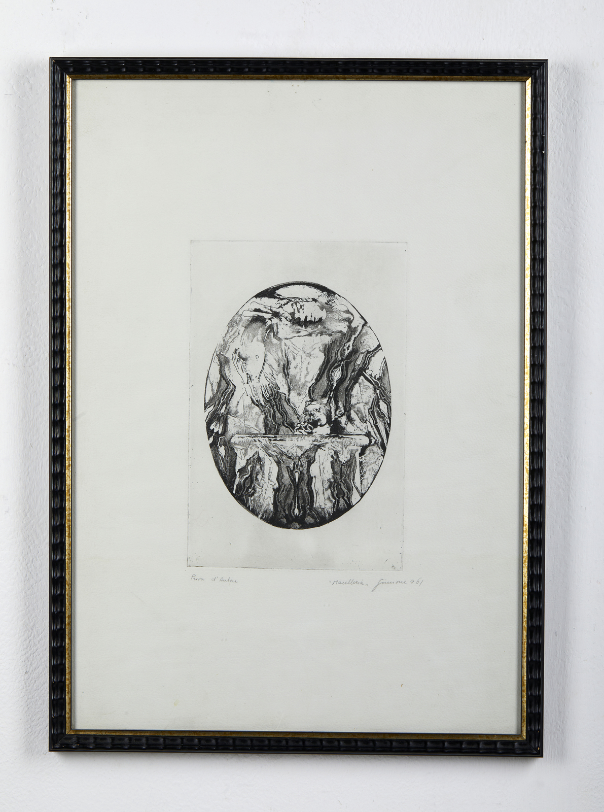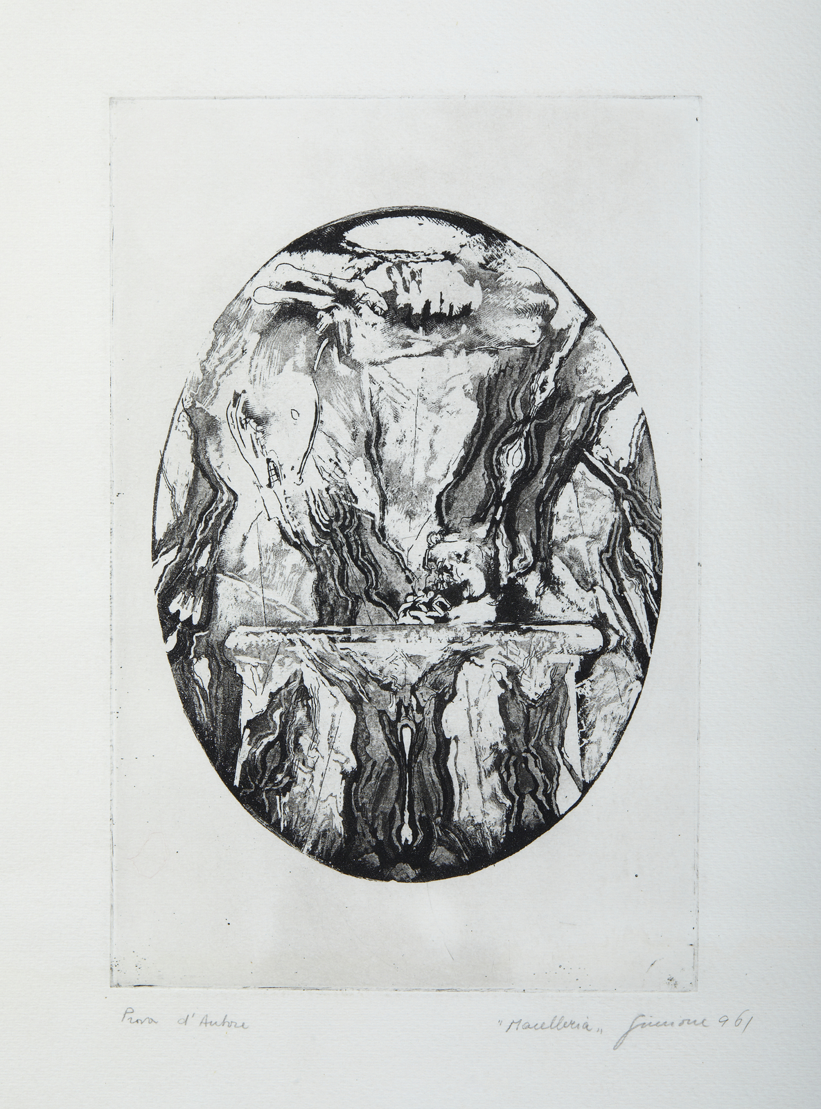 GUCCIONE PIERO (1935 - 2018) Macelleria. 1961. Acquaforte. Cm 35,00 x 50,00. P.d.a. Tiratura, titolo, firma e anno in basso a matita. Dimensione lastra: 24x16 cm. Lievi difetti. Cornice presente