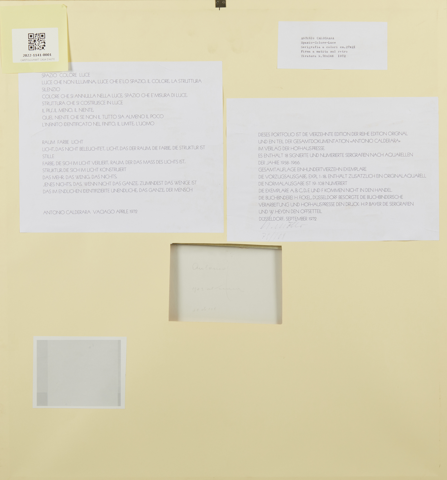 CALDERARA ANTONIO (1903 - 1978) Spazio-Colore-Luce. 1972. Serigrafia. Cm 27,00 x 27,00. 78/108. Al retro tiratura e firma a matita. Edizione totale: 114 copie di cui 108 esemplari numerati da 19/108 a 108/108 + 18 esemplari in edizione speciale con acquerello originale + 6 esemplari numerati dalla lettera A alla F. Queste grafiche fanno parte di un portfolio di 18 serigrafie firmate e numerate, da acquerelli degli anni 1958-1966, quattordicesima edizione della serie originale. Stampatori: H.P. Bayer.