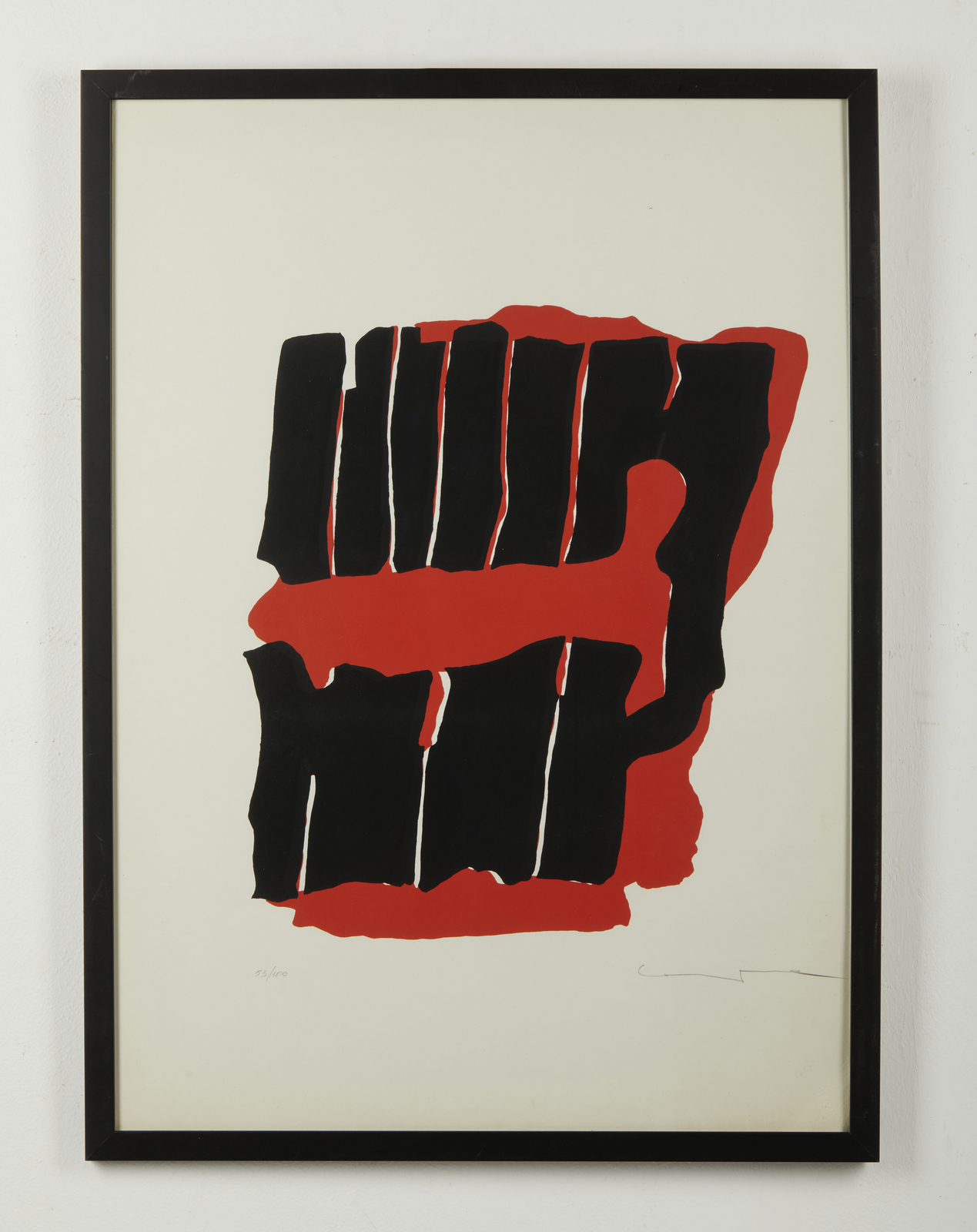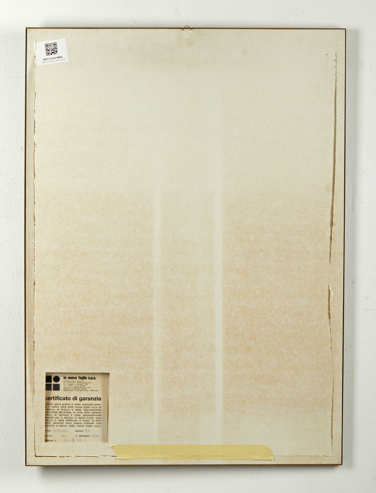 CONSAGRA PIETRO (1920 - 2005) Senza titolo. 1973. Serigrafia su carta. Cm 50,00 x 70,00. 53/100. Tiratura e firma in basso a matita. Timbro a secco Stamperia La Nuova Foglio, Pollenza, in basso a destra. Al retro cartiglio Nuova Foglio, Macerata; XVI Festival dei Due Mondi, Spoleto. Certificato di autenticità Arscritica moderna e contemporanea, Roma. Lievi difetti. Cornice presente