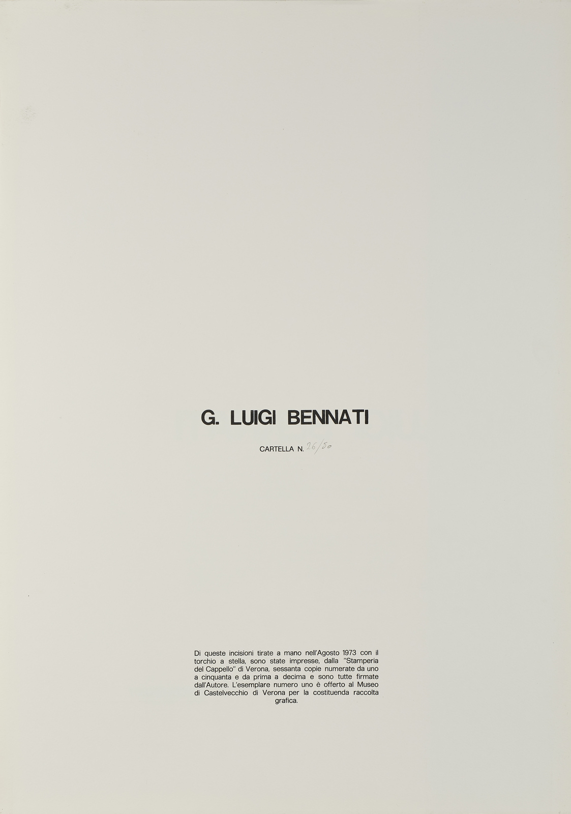 BENNATI LUIGI (n. 1929) Cartella composta da n.3 fogli. 1973. Acquaforte. Cm 50,00 x 70,00. 26/50. Tiratura e firma in basso a matita. Timbro a secco Comune di Verona Musei d'arte. Dimensioni lastre: 42,5x27,5 cm, 45x27,5 cm, 42x28 cm. Edizione totale: 60 esemplari numerati da 1 a 50 e 10 esemplari numerati I a X.