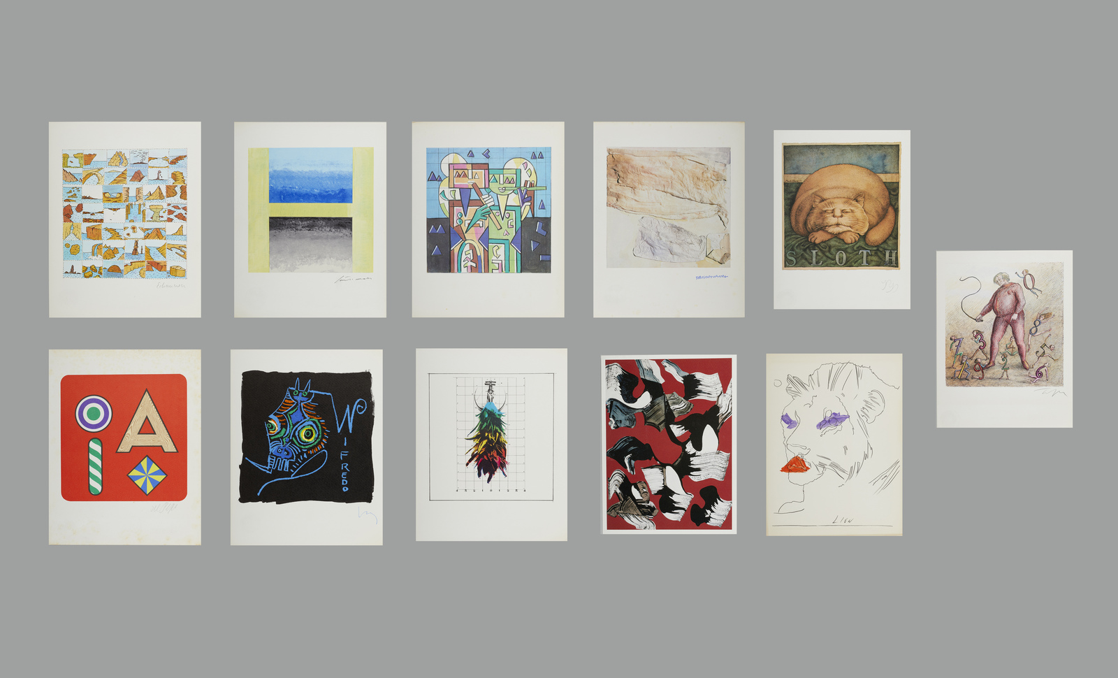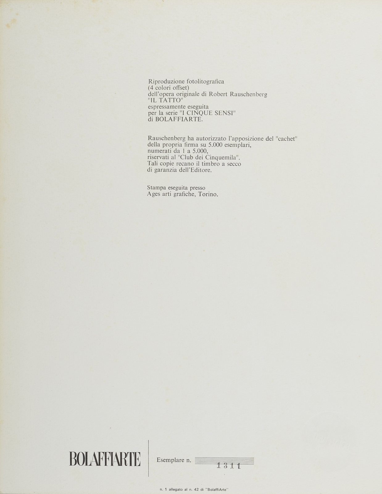 ARTISTI VARI Lotto composto da n.11 fogli. Fotolitografia. . 1. Robert Rauschenberg, Il tatto, eseguita per la serie "I cinque sensi" di Bolaffiarte. Esemplare n. 1311. Firma a stampa in basso a destra. Timbro a secco Bolaffiarte in basso a sinistra. 30x23.4 cm. Edizione totale: 5000 esemplari numerati da 1 a 5000. Stampatore: Ages arti grafiche, Torino.