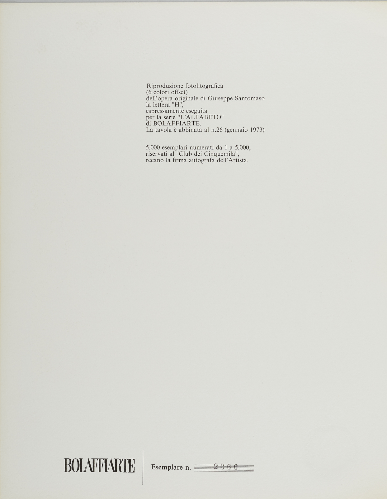 5. Giuseppe Santomaso, H, eseguita per la serie "L'alfabeto" di Bolaffiarte, eseguita per il n. 26, gennaio 1973. Esemplare n. 2366. Firma a matita in basso a destra. Timbro a secco Bolaffiarte in basso a sinistra. 30x23.4 cm. Edizione totale: 5000 esemplari numerati da 1 a 5000. Stampatore: Ages arti grafiche, Torino.
