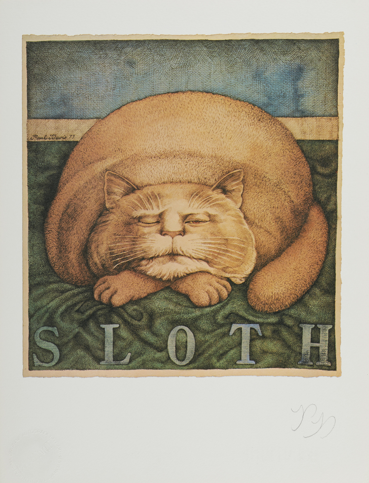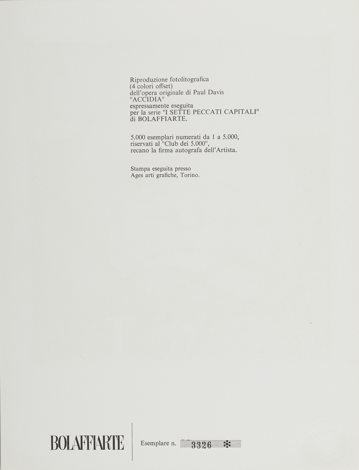 6. Paul Davis, Accidia, eseguita per la serie "I sette peccati capitali" di Bolaffiarte. Esemplare n. 3326. Firma a matita in basso a destra. Timbro a secco Bolaffiarte in basso a sinistra. 27.4x21 cm. Edizione totale: 5000 esemplari numerati da 1 a 5000. Stampatore: Ages arti grafiche, Torino.