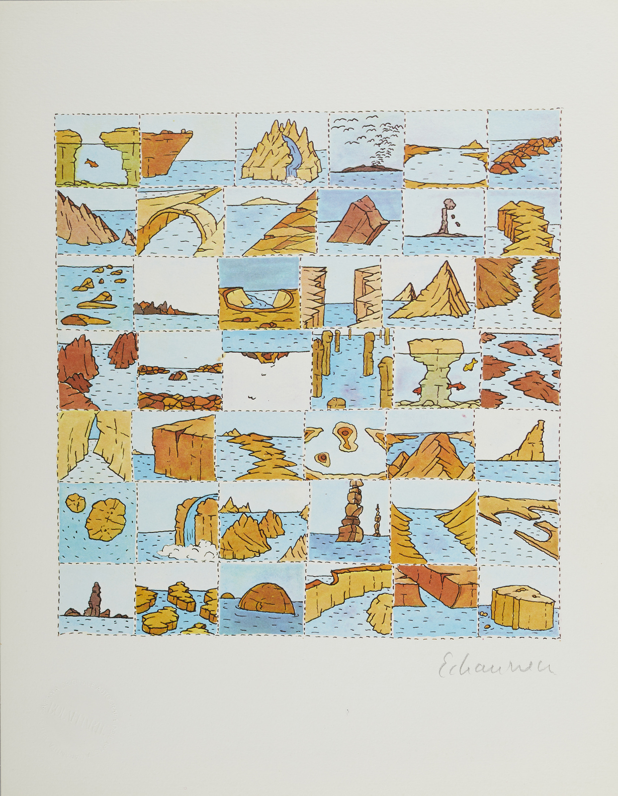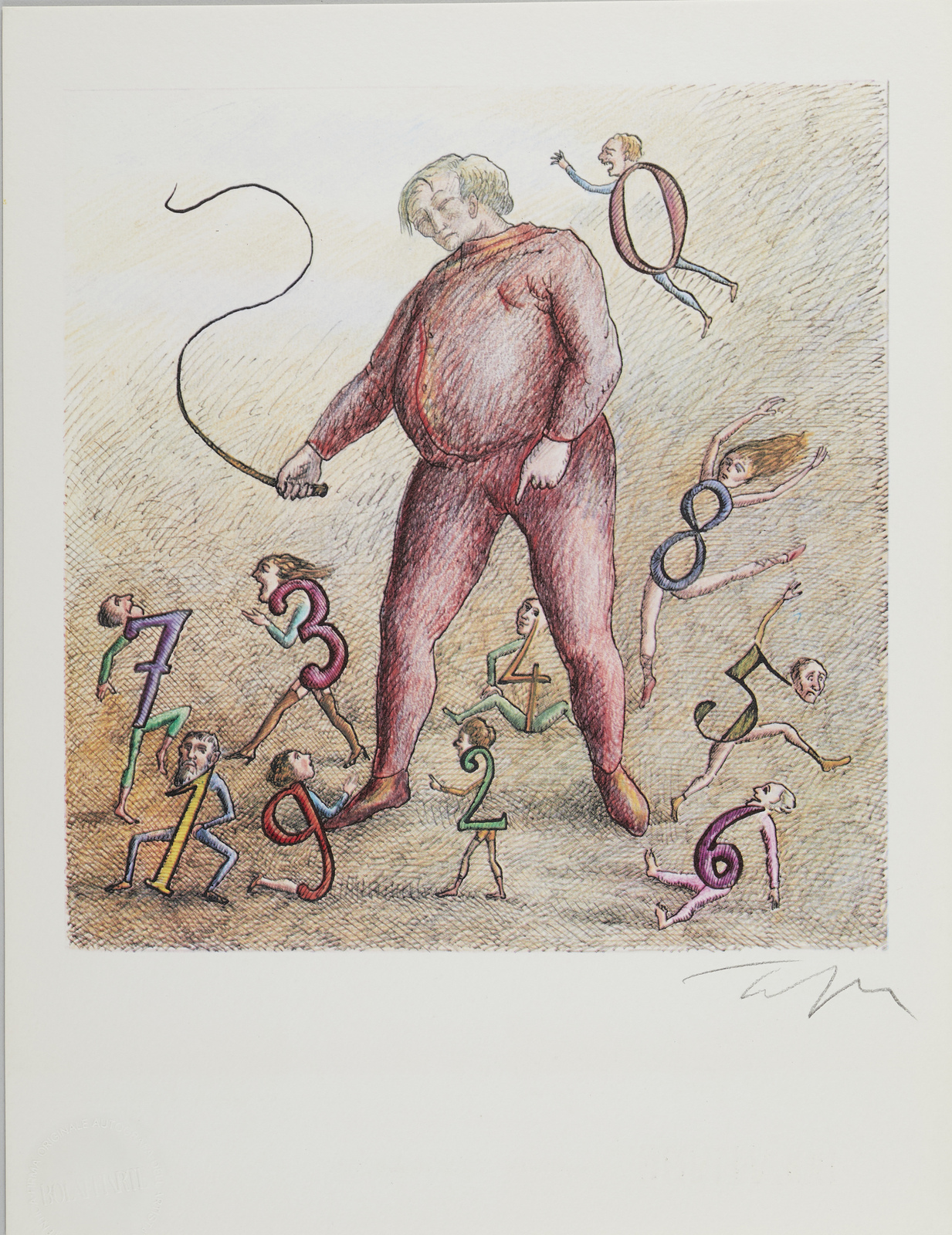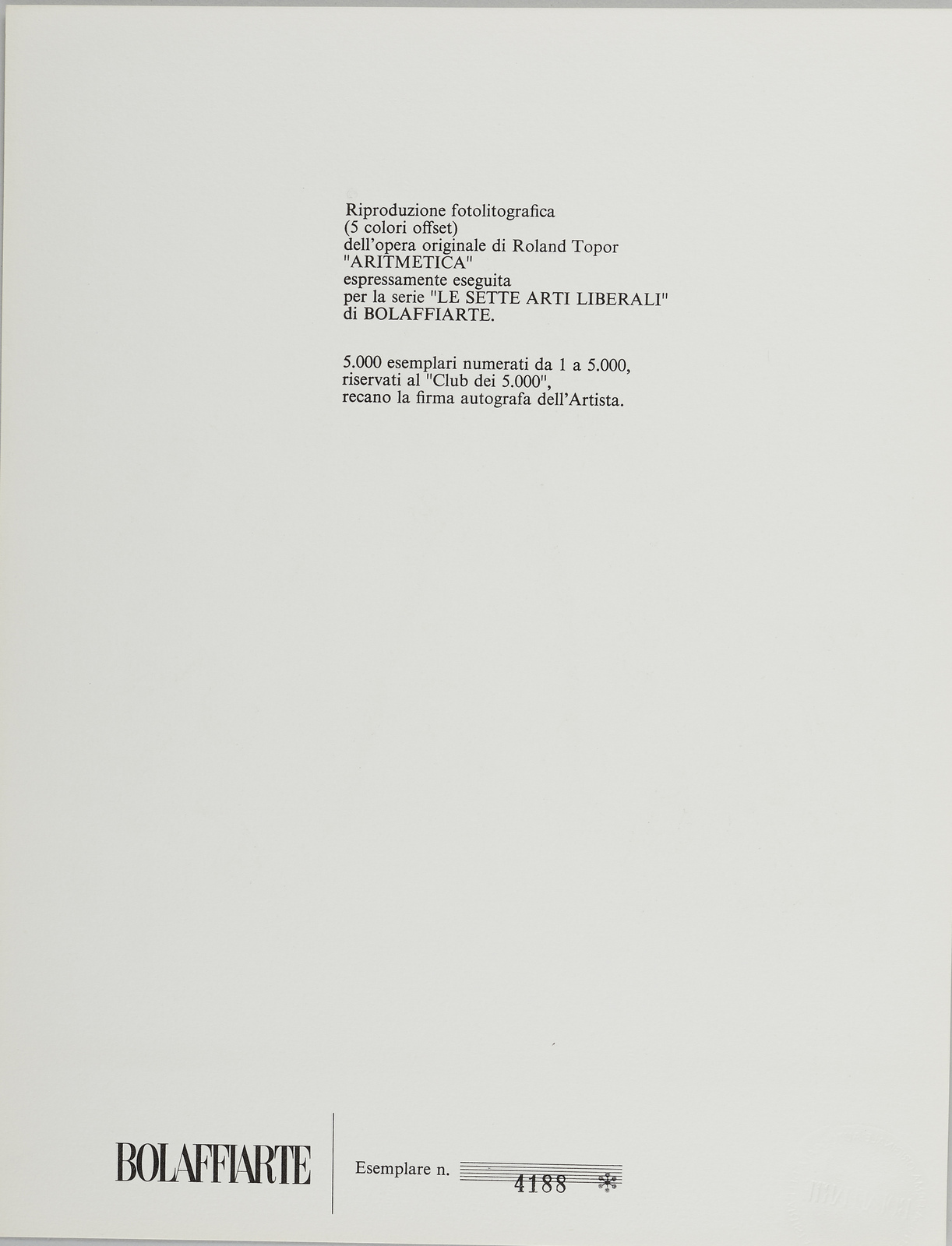 7. Roland Topor, Aritmetica, eseguita per la serie "Le sette arti liberali" di Bolaffiarte. Esemplare n. 4188. Firma a matita in basso a destra. Timbro a secco Bolaffiarte in basso a sinistra. 27.4x21 cm. Edizione totale: 5000 esemplari numerati da 1 a 5000. Stampatore: Ages arti grafiche, Torino.
