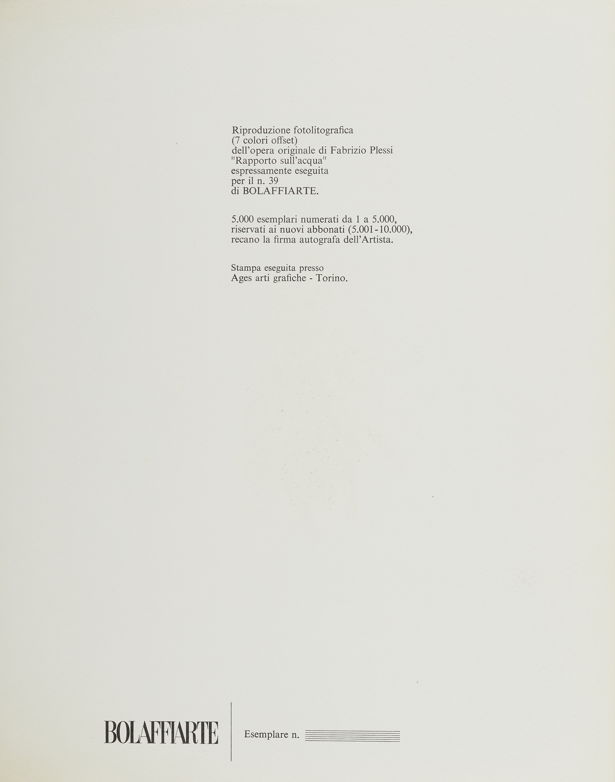 8. Fabrizio Plessi, Rapporto sull'acqua, eseguita per il n. 39 di Bolaffiarte. 30x23.4 cm. Edizione totale: 5000 esemplari numerati da 1 a 5000, riservati ai nuovi abbonati (5001-10000) recano la firma autografa dell'artista. Stampatore: Ages arti grafiche, Torino.