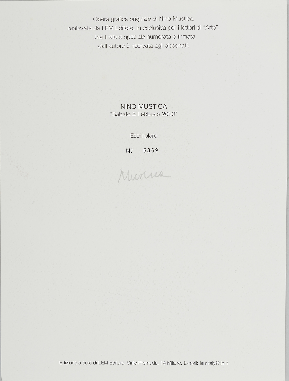 11. Nino Mustica, Sabato 5 febbraio 2000, realizzata da LEM Editore per i lettori di "Arte". Al retro firma a matita. Esemplare n. 6369. 27.3x20.5 cm.