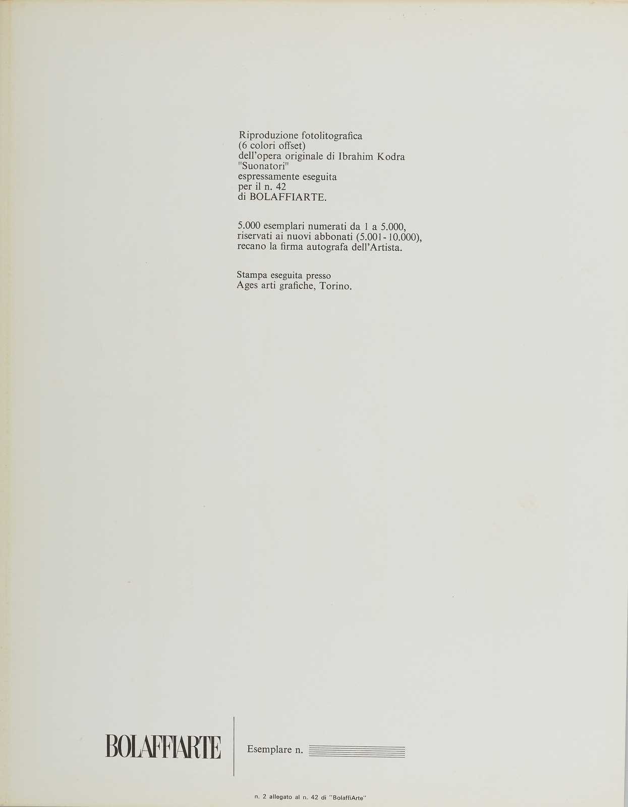10. Ibrahim Kodra, suonatori, eseguita per il n. 21 di Bolaffiarte. 30x23.4 cm. Edizione totale: 5000 esemplari numerati da 1 a 5000, riservati ai nuovi abbonati (5001-10000), recano la firma autografa dell'artista. Stampatore: Ages arti grafiche, Torino.