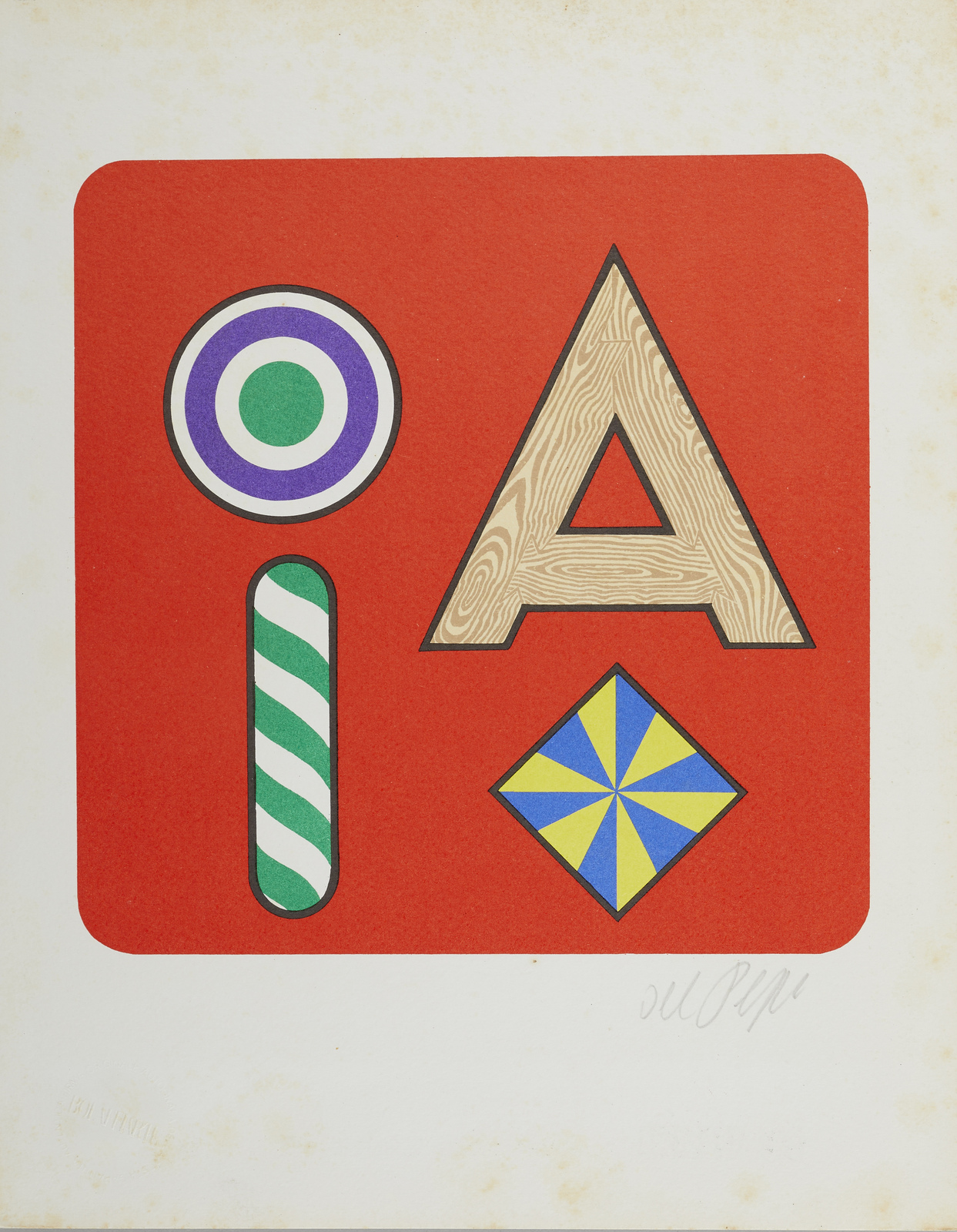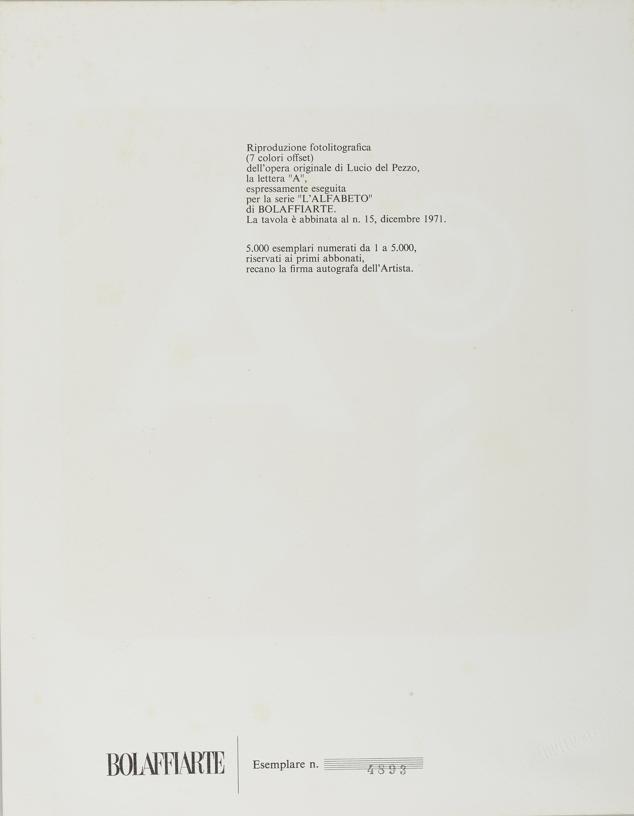 2. Lucio Del Pezzo, A, eseguita per la serie "L'alfabeto" di Bolaffiarte. Esemplare n. 4893. Firma a matita in basso a destra. Timbro a secco Bolaffiarte in basso a sinistra. 30x23.4 cm. Edizione totale: 5000 esemplari numerati da 1 a 5000.