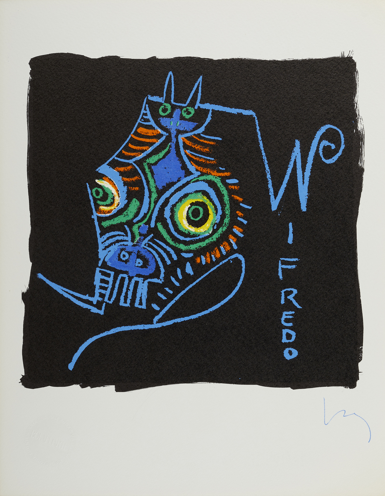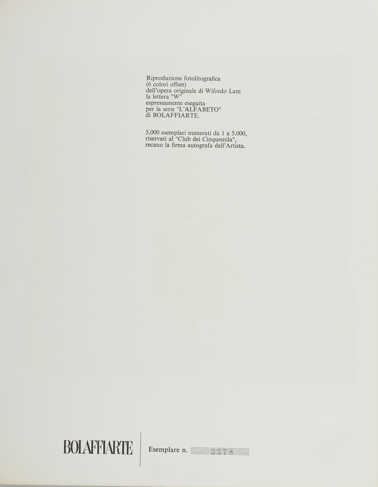 3. Wilfredo Lam, W, eseguita per la serie "L'alfabeto" di Bolaffiarte. Esemplare n. 3278. Firma a penna in basso a destra. Timbro a secco Bolaffiarte in basso a sinistra. 30x23.4 cm. Edizione totale: 5000 esemplari numerati da 1 a 5000.