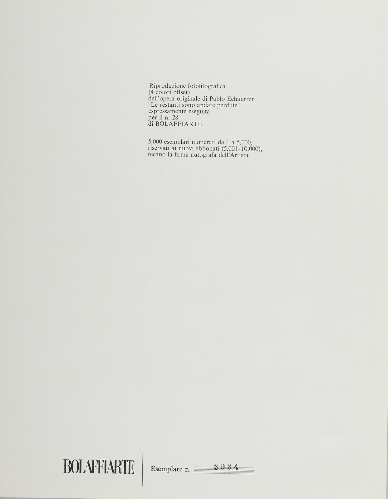 4. Pablo Echaurren, Le restanti sono andate perdute, eseguita per il n. 28 di Bolaffiarte. Esemplare n. 3943. Firma a matita in basso a destra. Timbro a secco Bolaffiarte in basso a sinistra. 30x23.4 cm. Edizione totale: 5000 esemplari numerati da 1 a 5000, riservati ai nuovi abbonati (5001-10000), recano la firma autografa dell'artista.