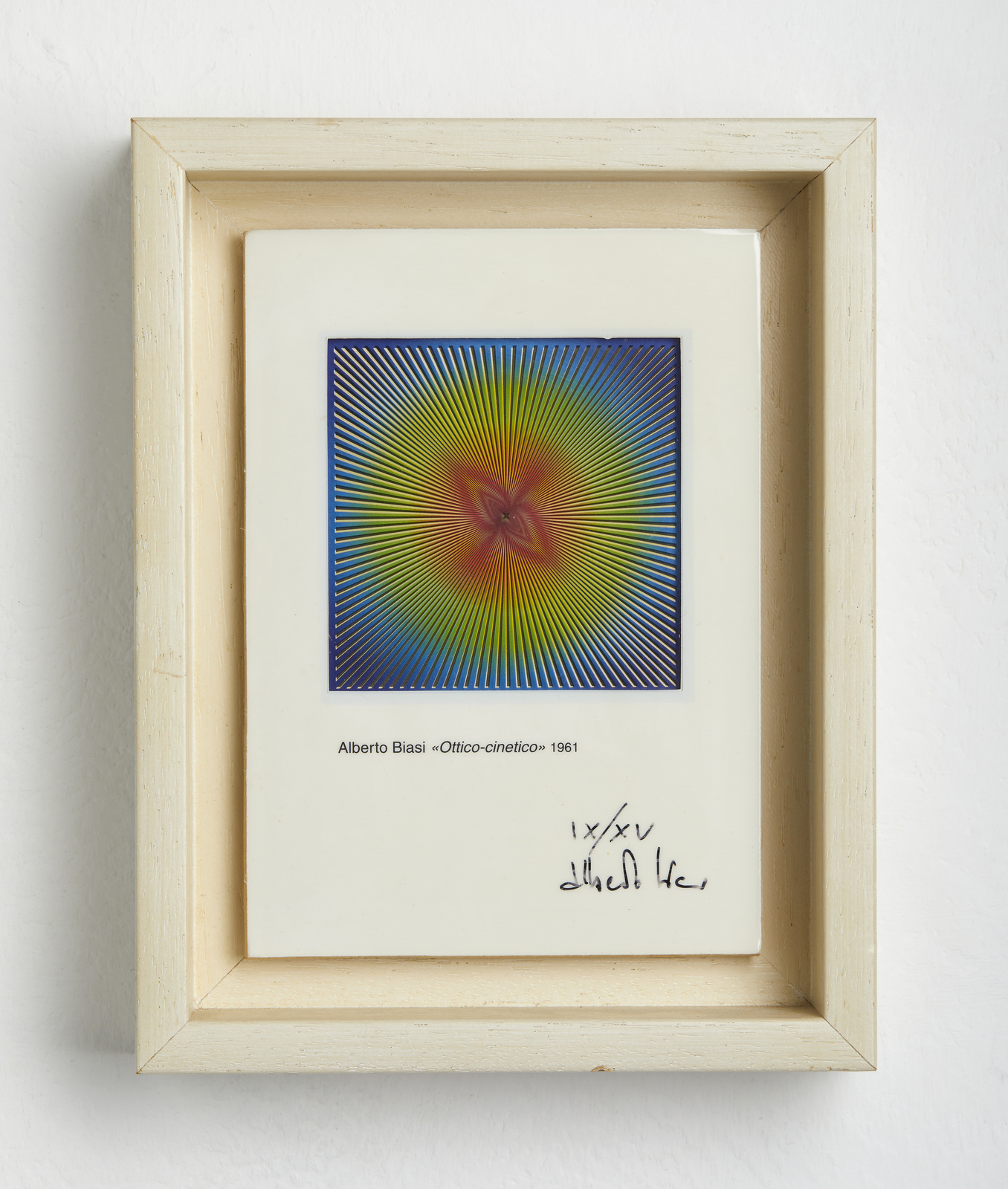 BIASI ALBERTO (n. 1937) Ottico-cinetico. . Cartolina. Cm 11,70 x 16,50. IX/XV. Tiratura e firma in basso a destra a pennarello. Cartolina cartonata, raffigurante un'opera dell'Artista del 1961, edita in occasione dell'esposizione "Luce movimento & programmazione - Kinetische Kunst aus Italien 1958-1968". Stampatore: Zanardi, Padova. Cornice presente