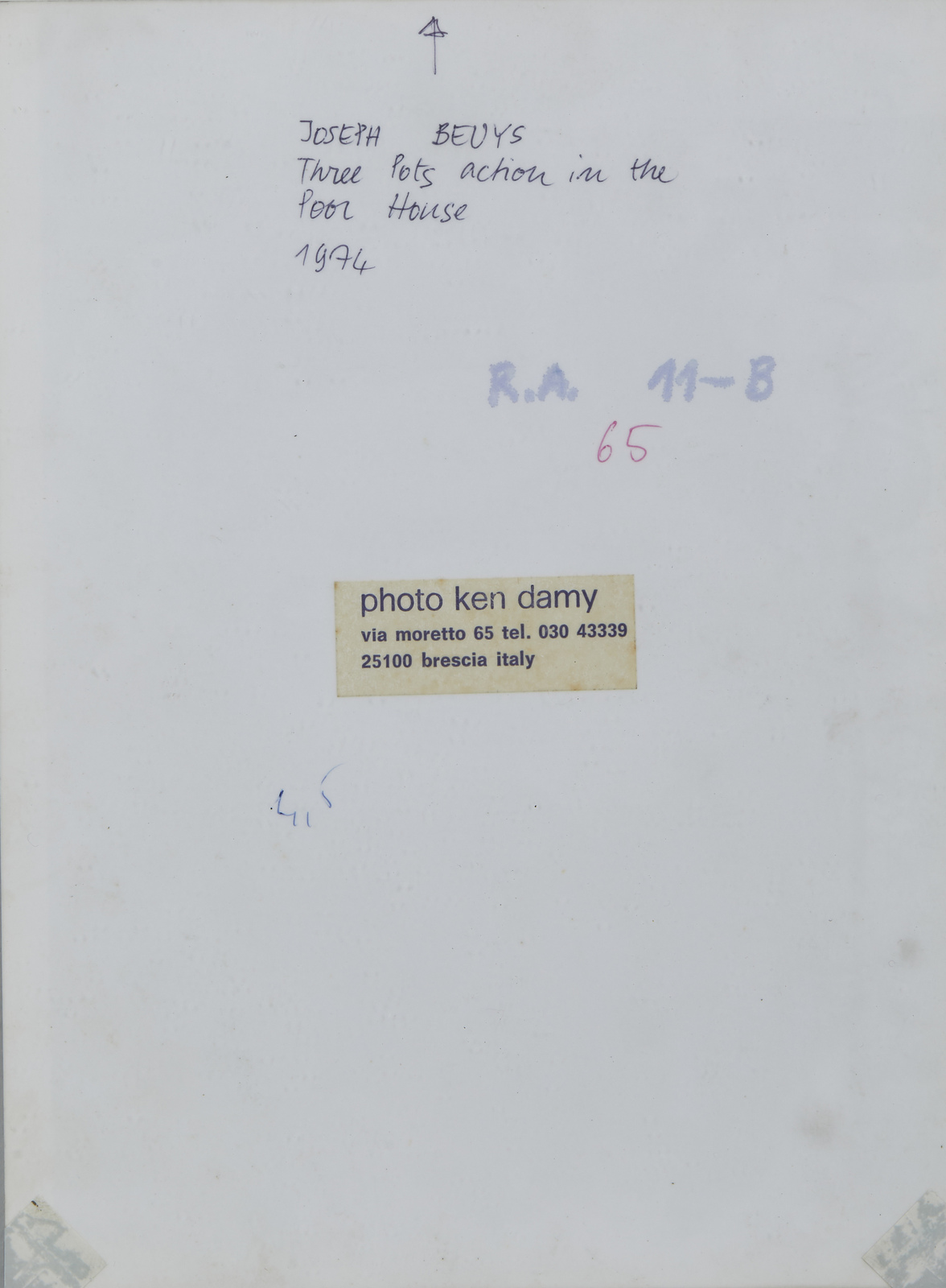 BEUYS JOSEPH (1921 - 1986) Three Pots action in the Poor House. 1974. Fotografia b/n. Cm 17,50 x 24,00. Al retro titolo, anno e cartiglio Photo Ken Damy, Brescia. . Cornice presente