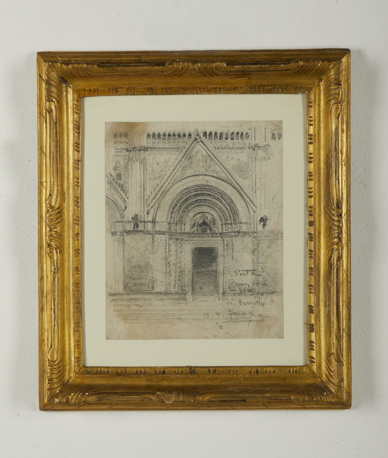 FRISIA DONATO (1883 - 1953) Porta principale del Duomo di Orvieto. 1928. Matita su carta. Cm 22,00 x 27,50. Firma e titolo in basso a destra. Al retro cartiglio descrittivo Galleria d'Arte Antologia, Monza. Provenienza: Collezione Frisia. Opera archiviata dal figlio del Maestro al n. E.F. 224. Certificato d'autenticità rilasciato da Giovanni Camillo Mapelli. Difetti. Cornice presente