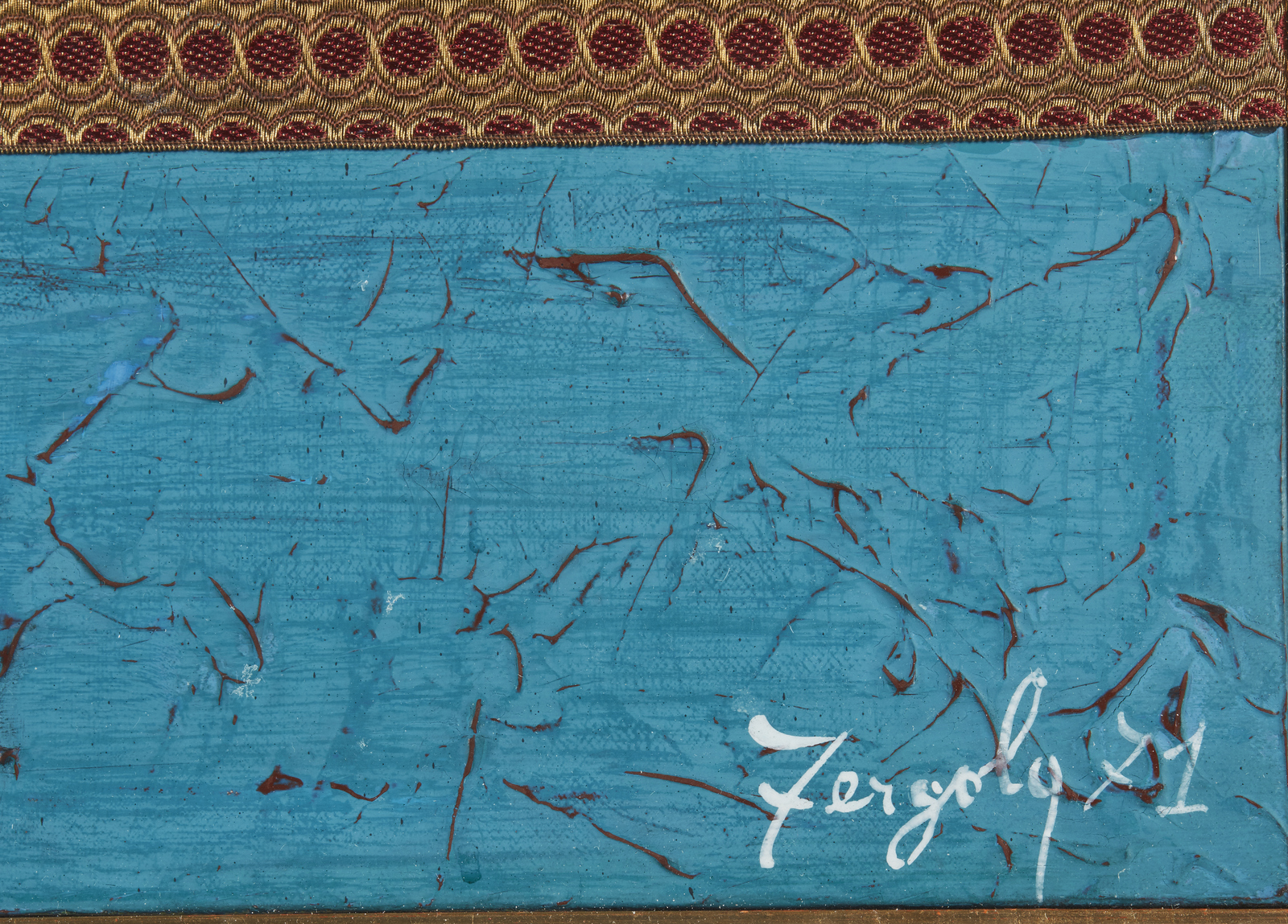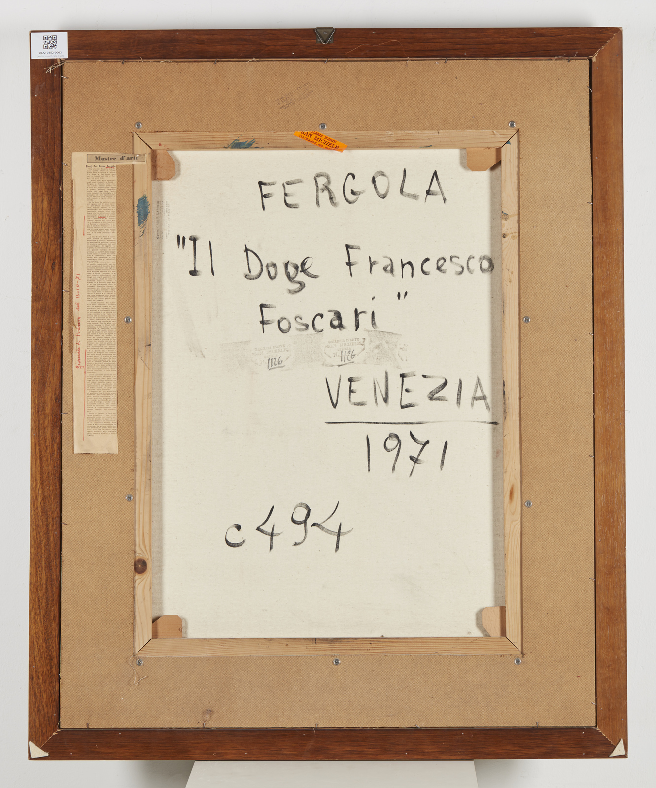 FERGOLA SERGIO (1936 - 1994) Il Doge Francesco Foscari. 1971. Olio su tela . Cm 60,00 x 80,00. Firma e anno in basso a destra. Al retro firma, titolo e anno. Lievi difetti-. Cornice presente