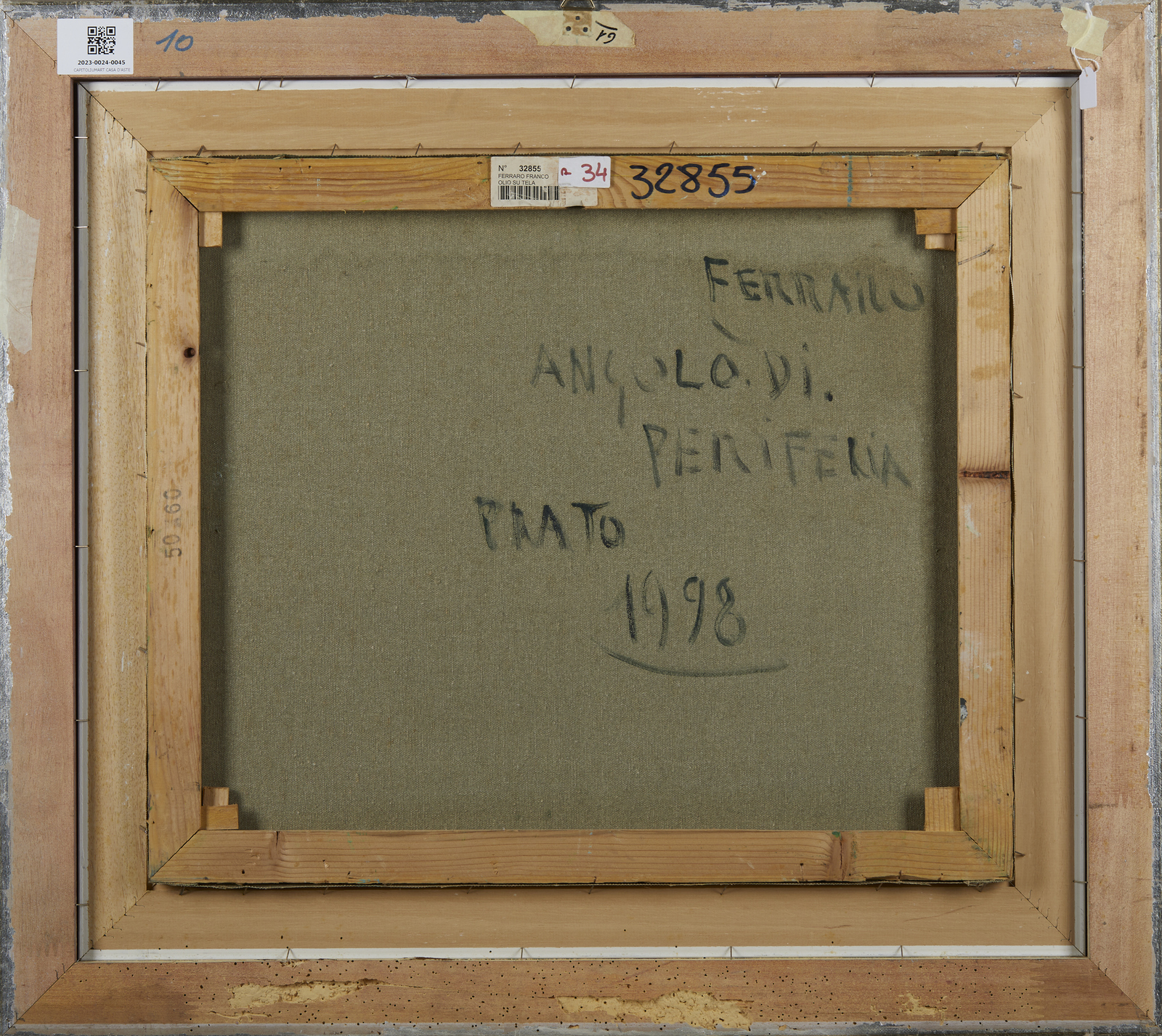 FERRARO FRANCO (n. 1929) Angolo di periferia. Prato. 1998. Olio su tela . Cm 60,00 x 60,00. Firma e anno in basso a destra. Al retro titolo, firma e anno. Certificato di provenienza Galleria d'Arte Orler, Favaro Veneto. . Cornice presente
