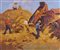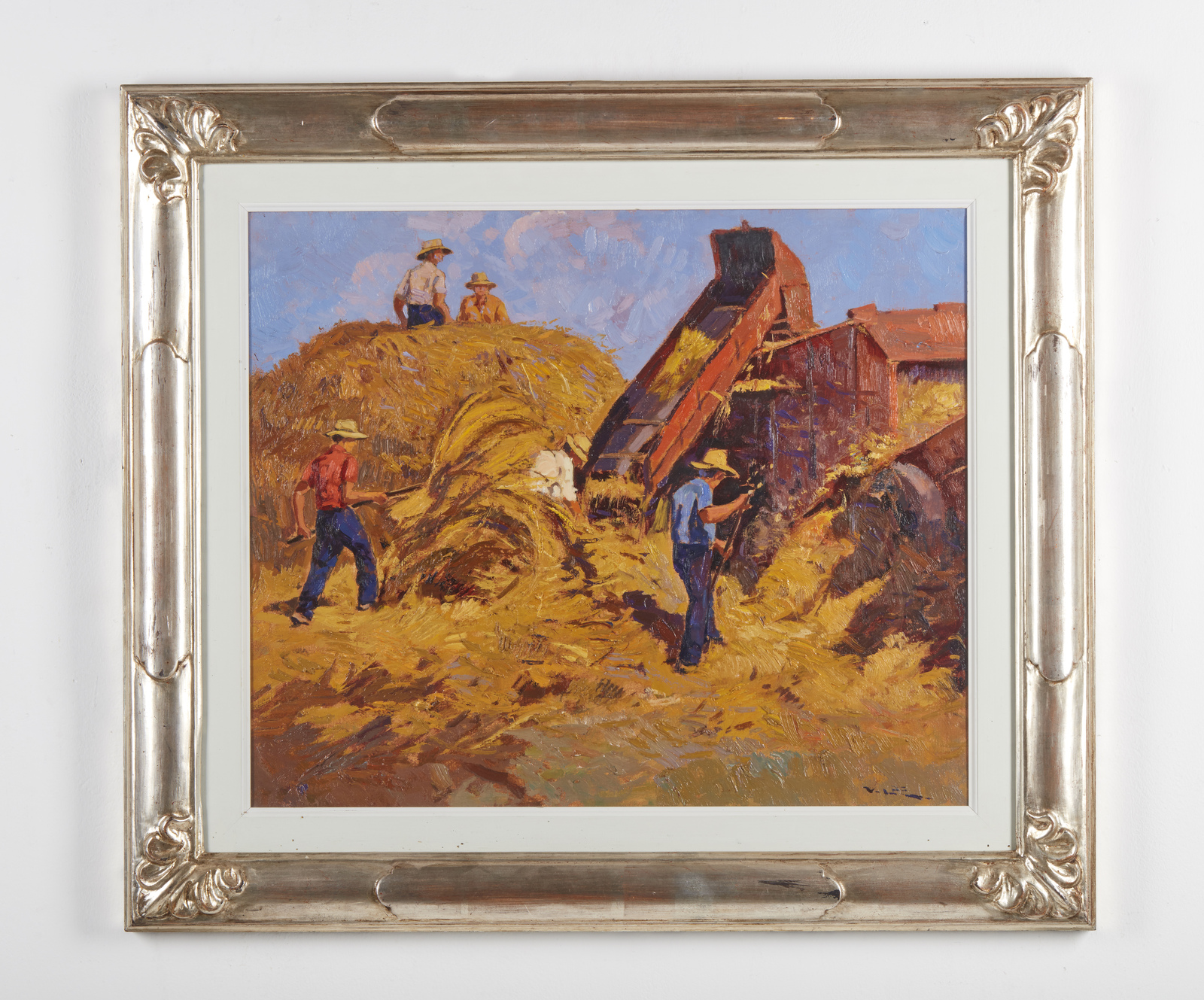 VOLPE ANGIOLO (n. 1943) Trebbiatori. . Olio su tela . Cm 60,00 x 50,00. Firma, titolo e cartiglio della Galleria d'Arte Fiorentina, Castiglione della Pescaia, al retro. . Cornice presente