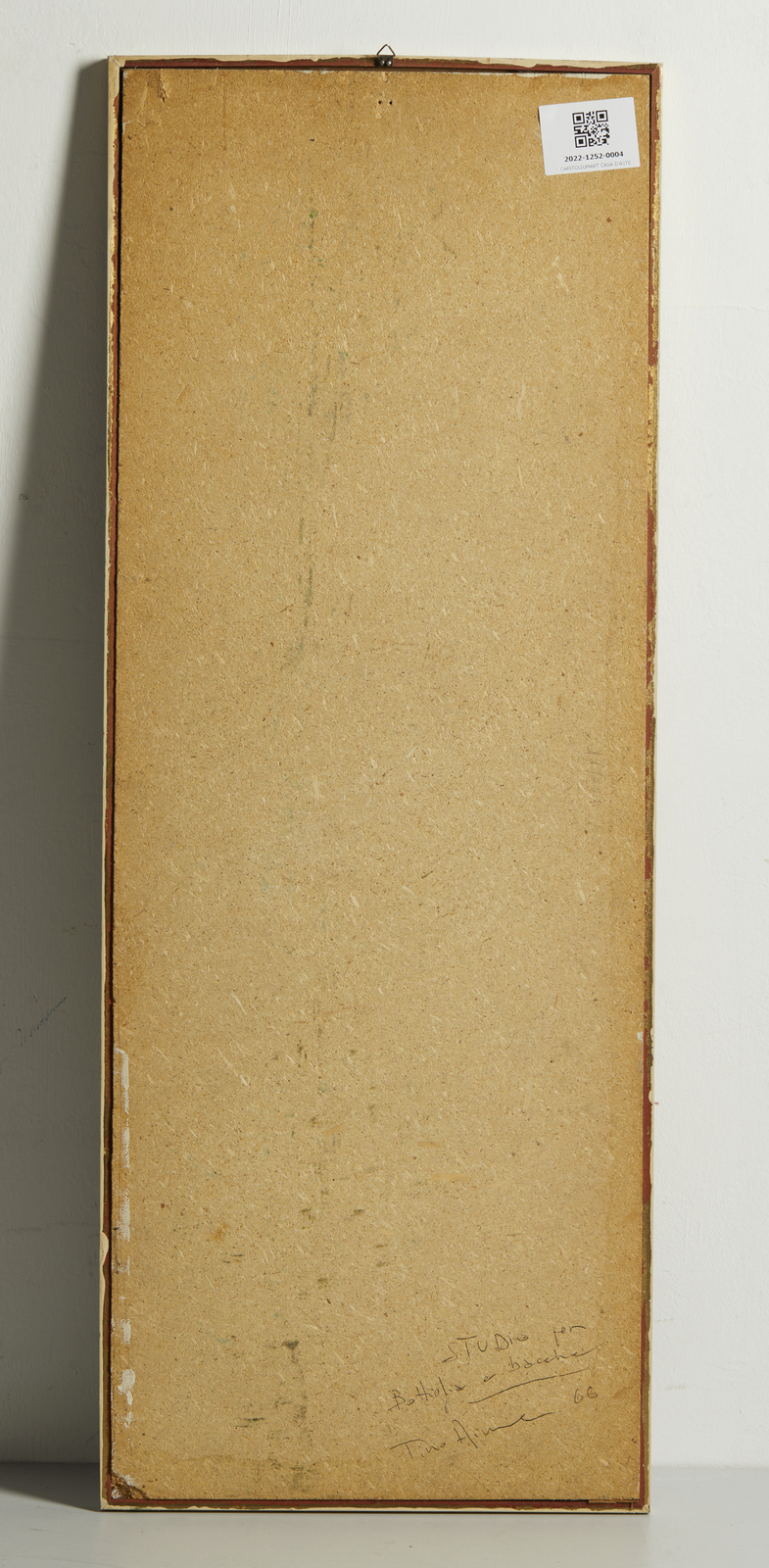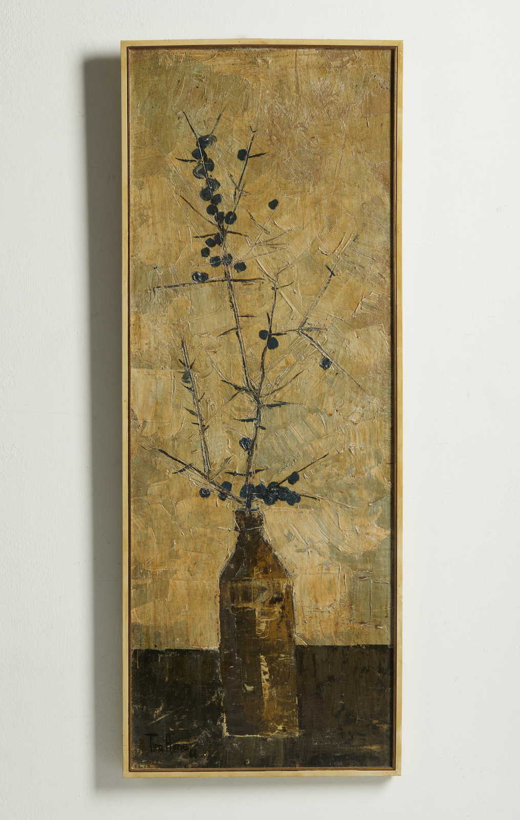 AIME TINO (1931 - 2017) Studio per Bottiglia e bacche. 1966. Olio su tavola. Cm 29,50 x 80,00. Firma e anno in basso a sinistra. Al retro titolo, firma e anno. Lievi difetti. Cornice presente