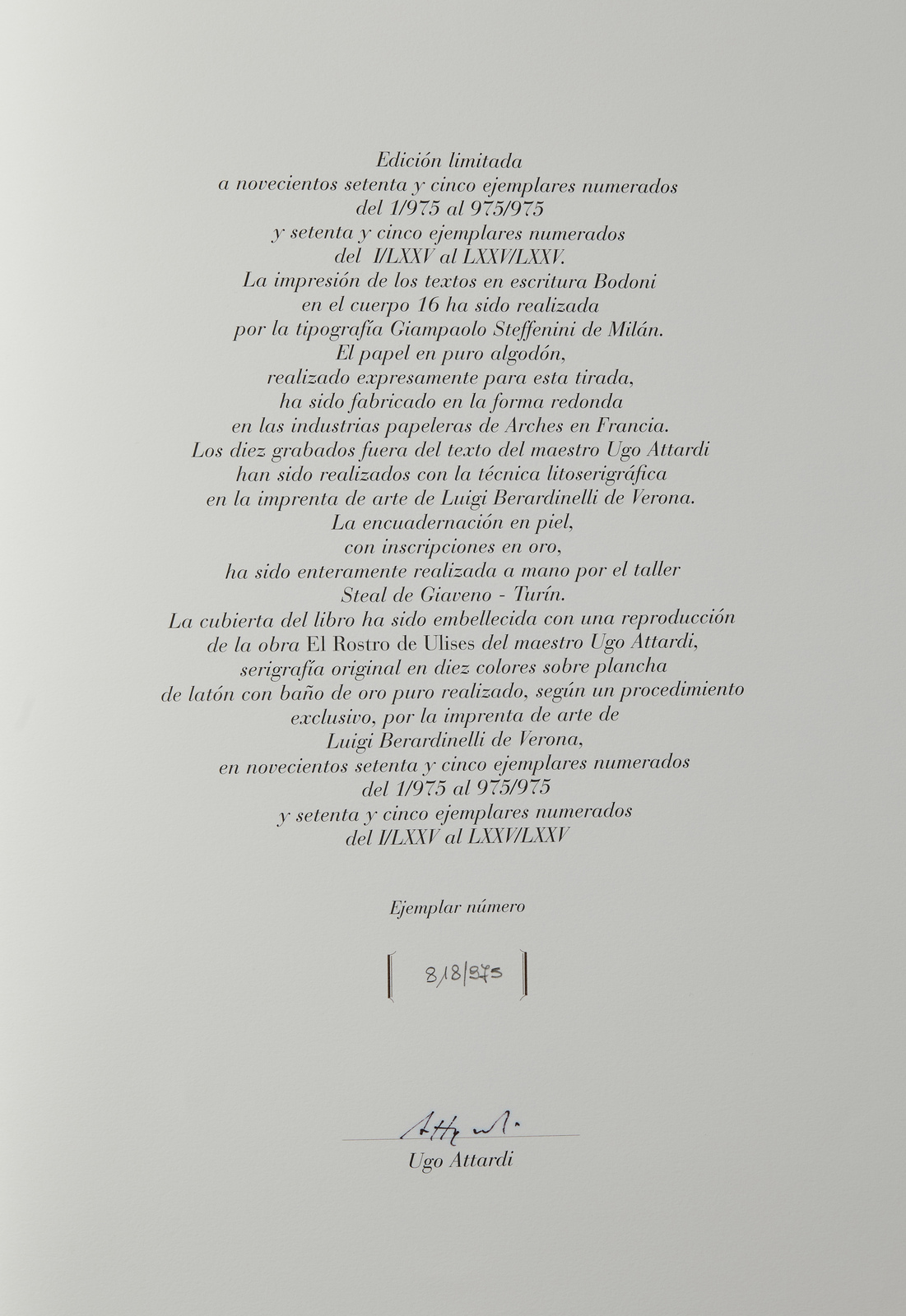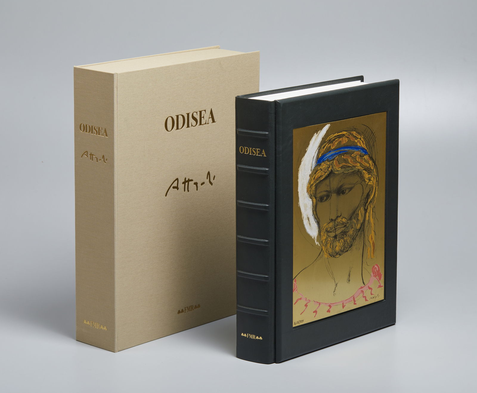 ATTARDI UGO (1923 - 2006) Homero. Odissea. 2002. Libro d'arte. Cm 37,50 x 50,00 x 10,50. 818/975. Tiratura e firma in basso sulla copertina. Tiratura e firma nel colophon. Libro d'artista composto da 10 tavole litografate. In copertina: Il rostro di Ulisse, Ugo Attardi, serigrafia su lastra di ottone bagnato in oro, Stamperia d'arte Berardinelli, Verona. Edizione totale: 975+LXXV esemplari. Confezione originale. Editore: FMR-Art'é, Bologna, 2002. Certificato di autenticità e provenienza FMR Società del Gruppo Art'è, Edizione in lingua spagnola.