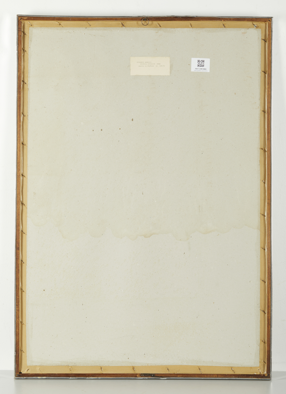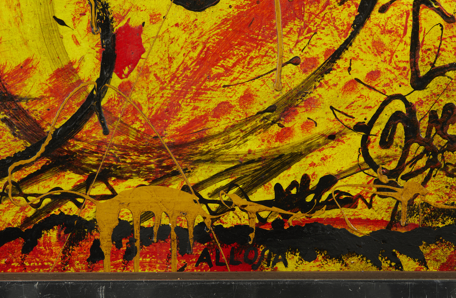 ALLOSIA GIUSEPPE (1910 - 1983) Pittura nucleare. 1954. Smalto su cartone. Cm 70,00 x 100,00. Firma in basso a destra. Al retro cartiglio descrittivo. Cornice presente