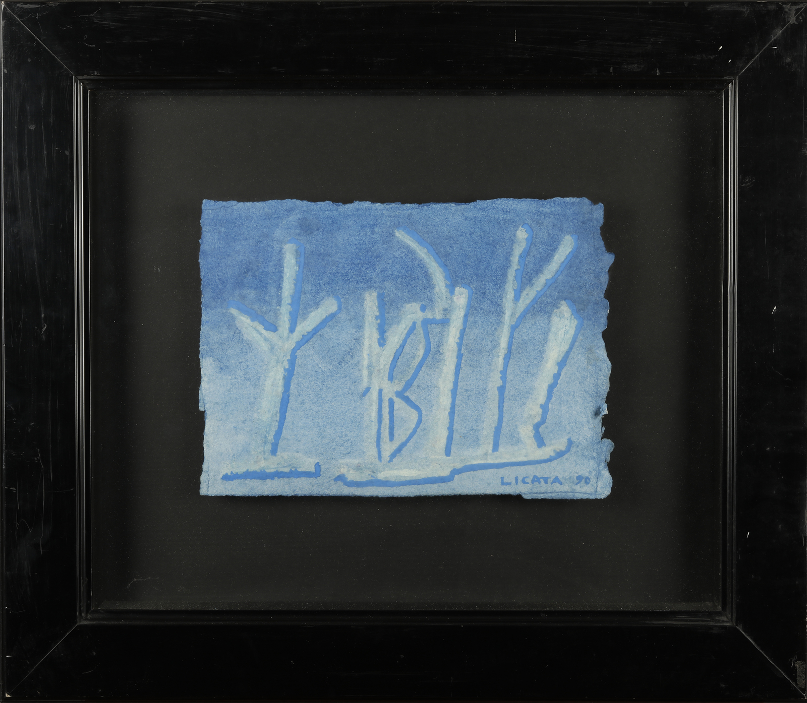 LICATA RICCARDO (1929 - 2014) Composizione. 1990. Tempera ad uovo. Cm 28,00 x 20,00. Firma e anno in basso a destra. Al retro cartiglio descrittivo della Galleria San Carlo, Milano e dichiarazione di autenticità Studio d'arte La Fortezza, Savona. Cornice presente