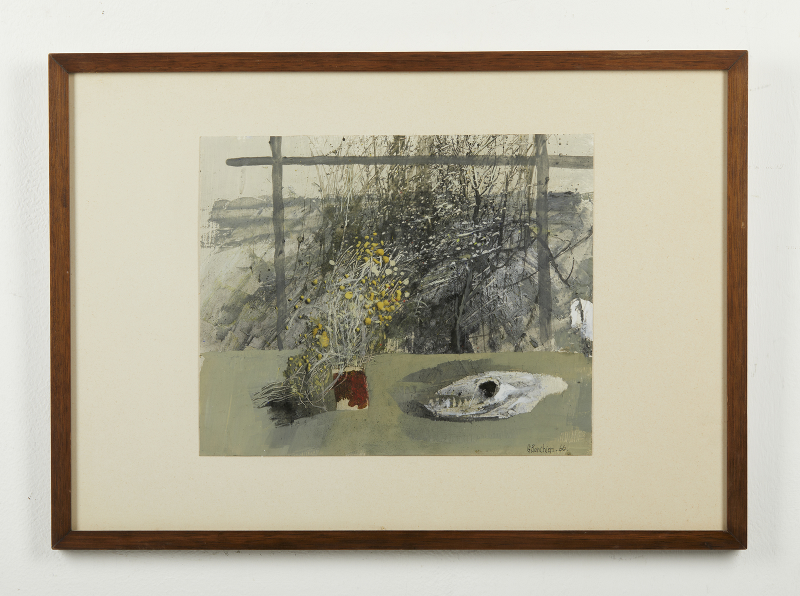 BANCHIERI GIUSEPPE (1927 - 1994) Senza titolo. 1966. Tempera su carta. Cm 29,00 x 24,00. Firma e anno in basso a destra. Cornice presente
