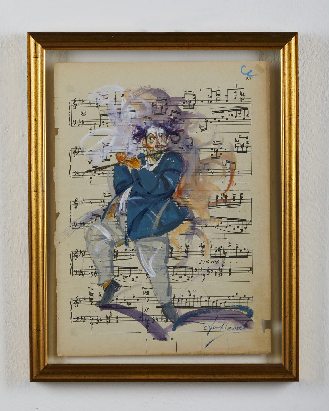 FONTIROSSI ROBERTO (n. 1940) Senza titolo. Tecnica mista su spartito musicale. Cm 30,00 x 23,00. Firma in basso a destra. Autentica dell'artista su fotografia. Cornice presente