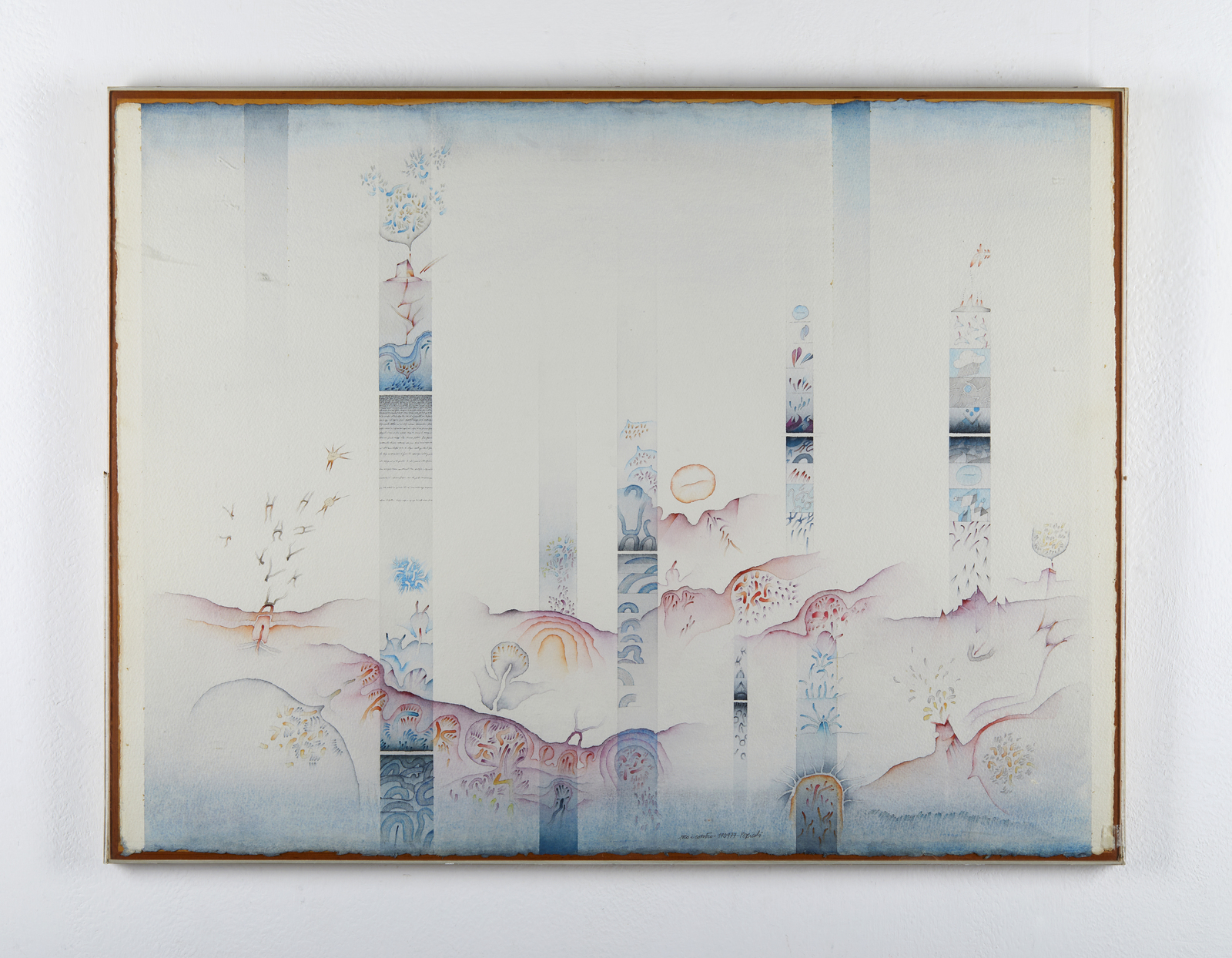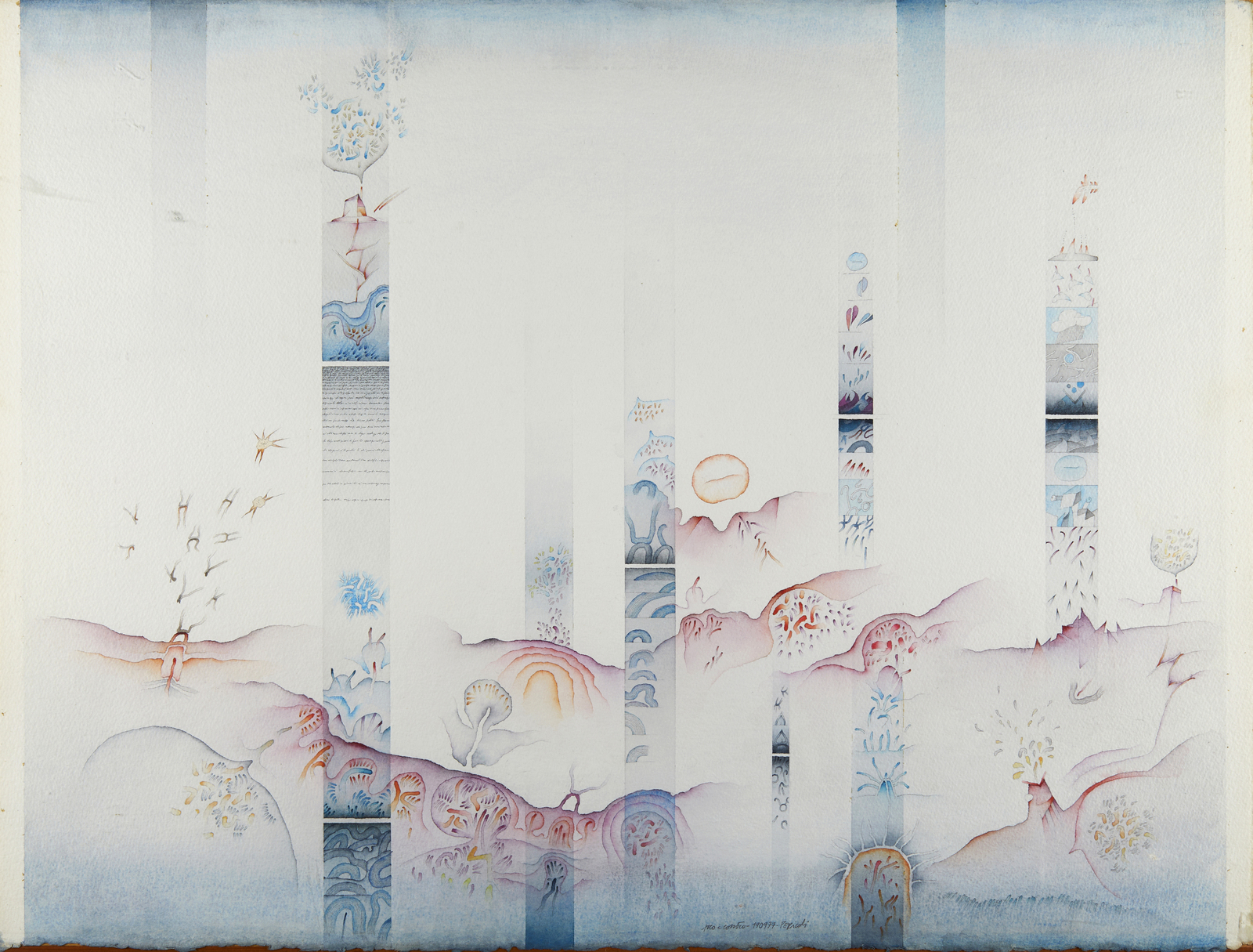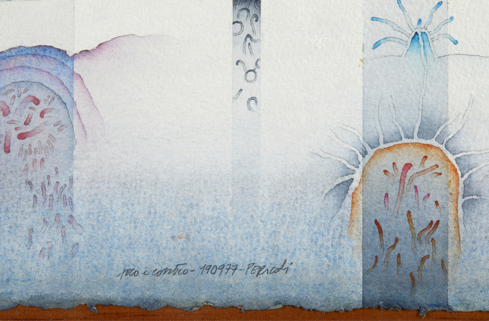 PERICOLI TULLIO (1936 - 2006) Il pro e il contro. 1977. Acquarello su cartoncino. Cm 70,00 x 50,00. Titolo, firma e anno in basso al centro a matita. Entro teca in plexiglass. Lievi difetti. Cornice presente
