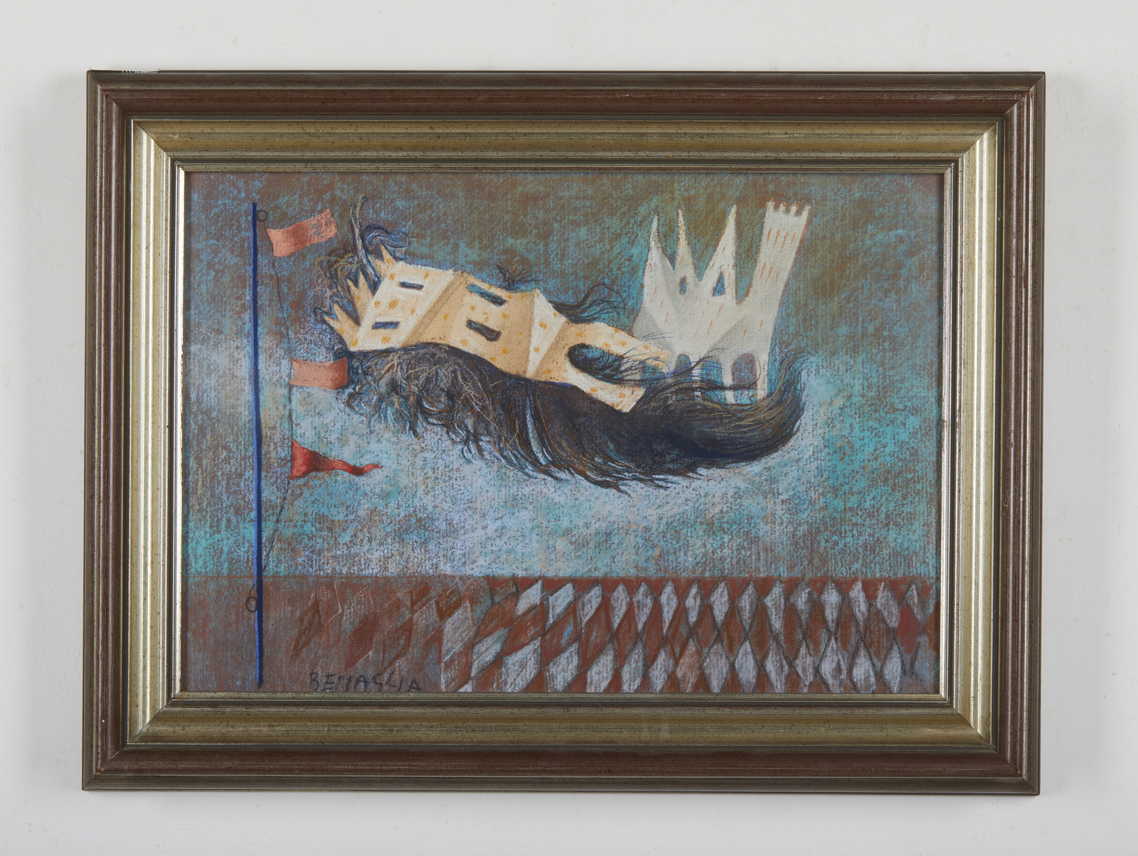 BENAGLIA ENRICO (n. 1938) Nostalgia di castelli. Pastelli su carta. Cm 49,00 x 34,00. Firma in basso a sinistra. Autentica dell'artista su fotografia. . Cornice presente