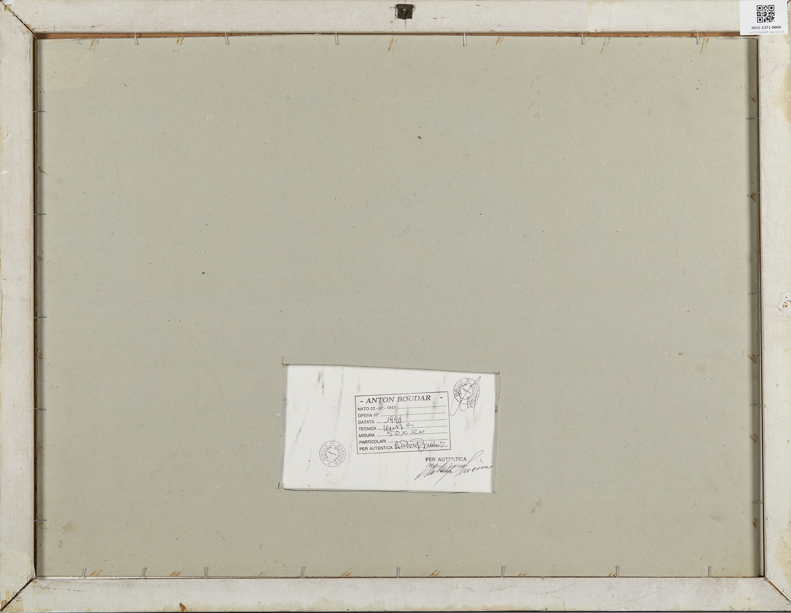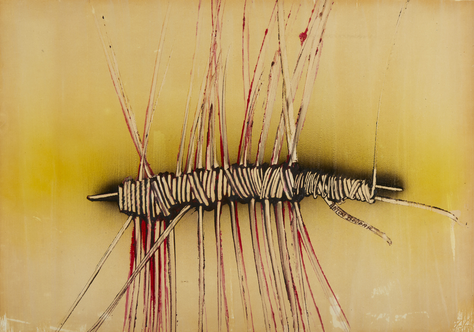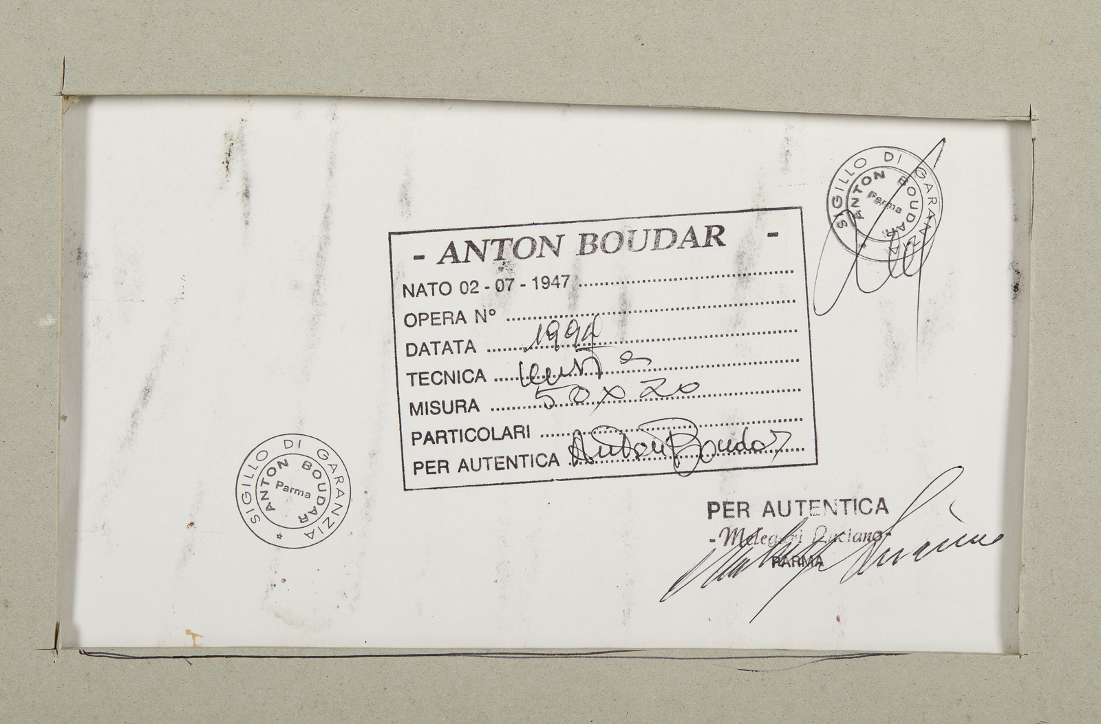 BOUDAR ANTON Senza titolo. 1994. Tecnica mista su carta. Cm 70,00 x 50,00. Firma al centro. Al retro firma su cartiglio descrittivo con autentica e timbri Anton Boudar, Parma. Cornice presente