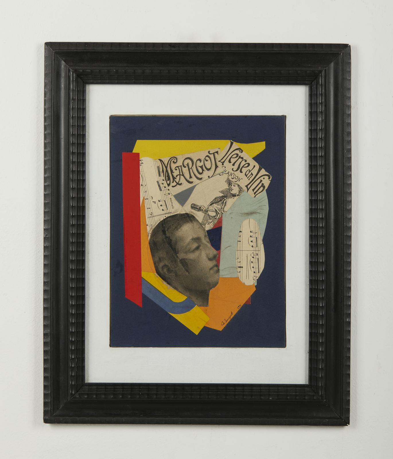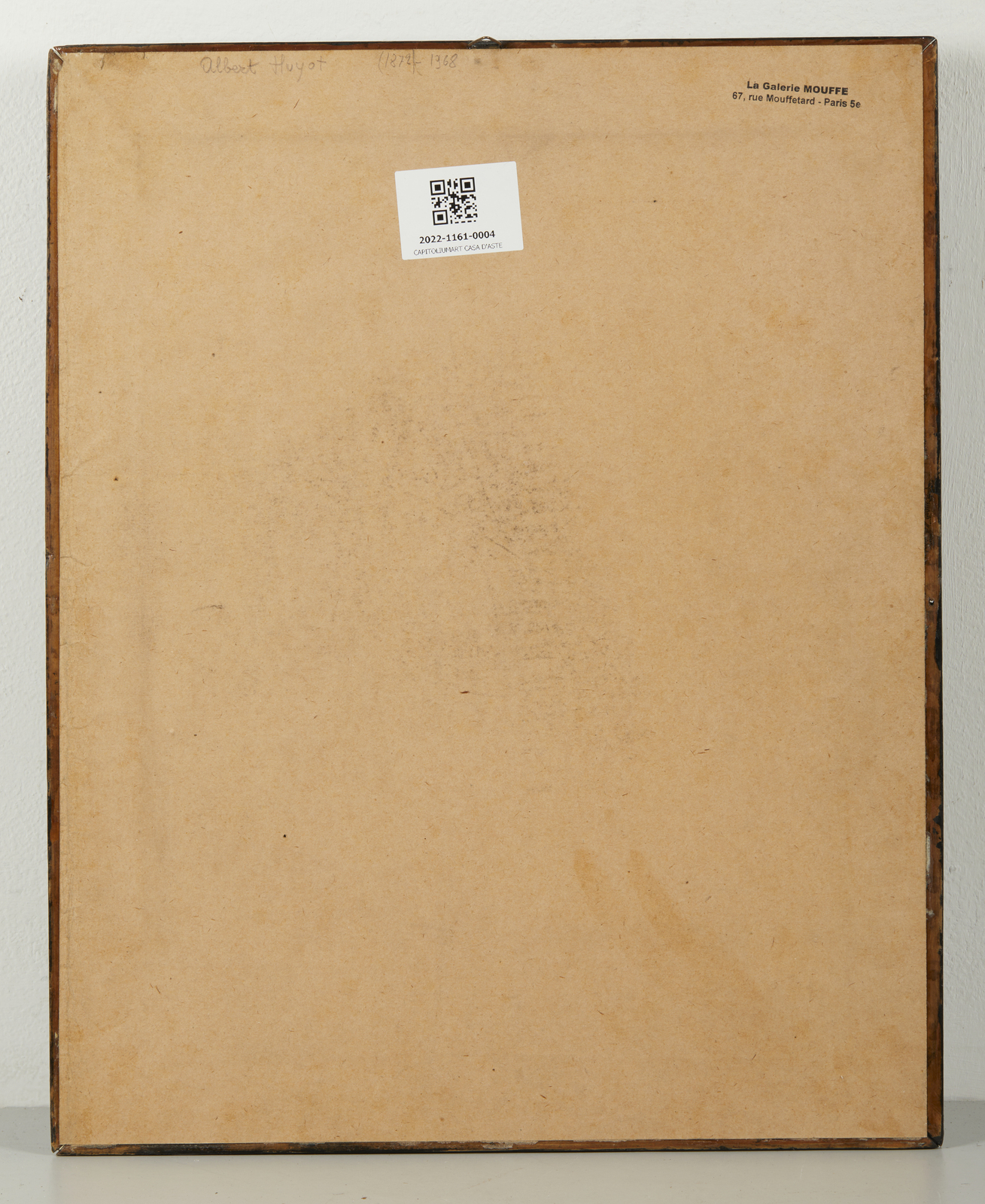 HUYOT ALBERT (1872 - 1968) Margot verse du vin. . 1922. Tecnica mista e collage su carta. Cm 22,00 x 29,00. Firma e anno in basso a destra. Al retro timbro Galerie Mouffe. Rue Mouftard, Paris. . Cornice presente