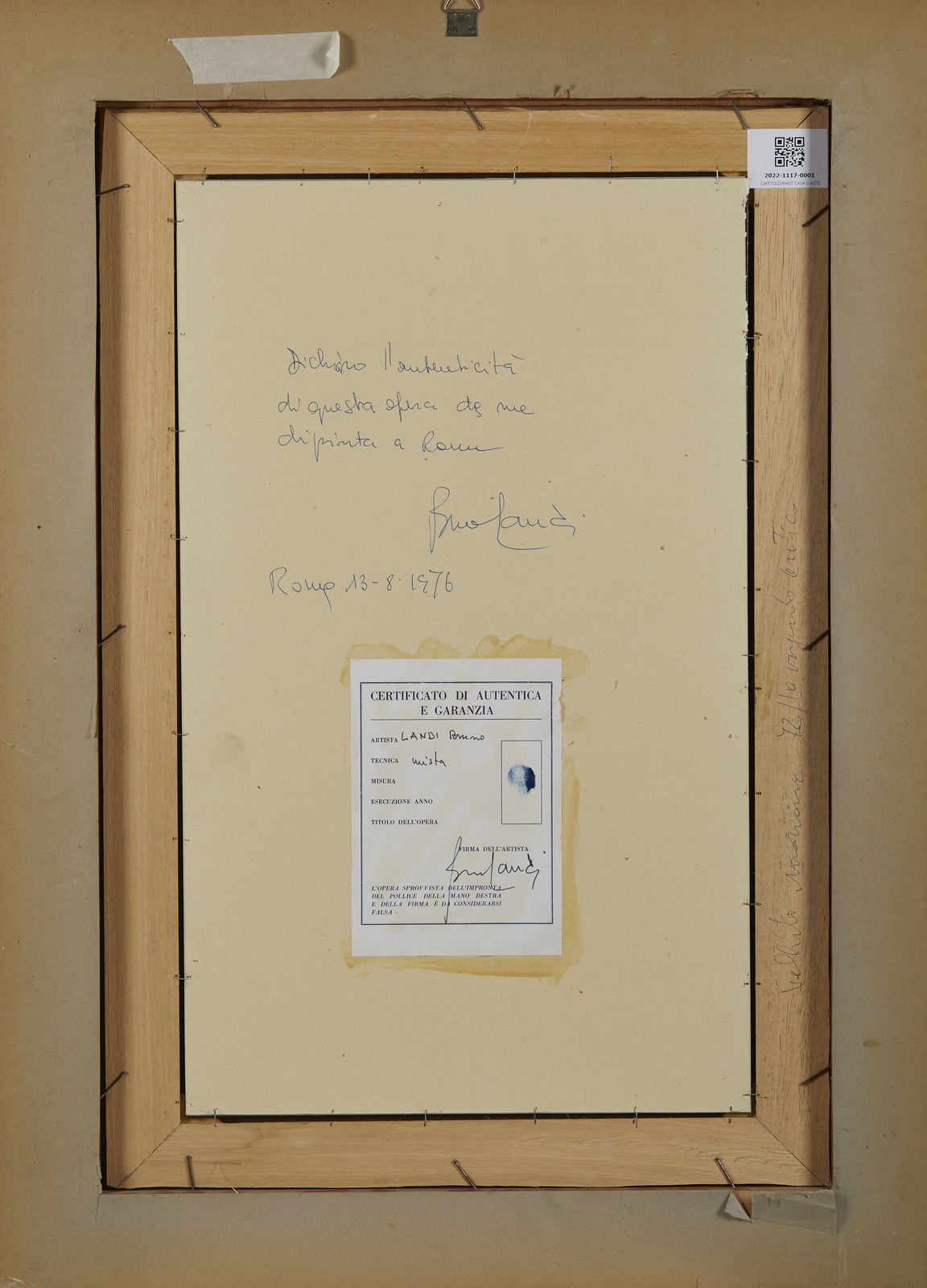 LANDI BRUNO (n. 1941) Senza titolo. 1976. Tecnica mista su cartoncino. Cm 37,00 x 61,50. Firma e anno in basso a destra. Al retro firma, anno e dichiarazione di autenticità dell'artista. Lievi difetti. Cornice presente